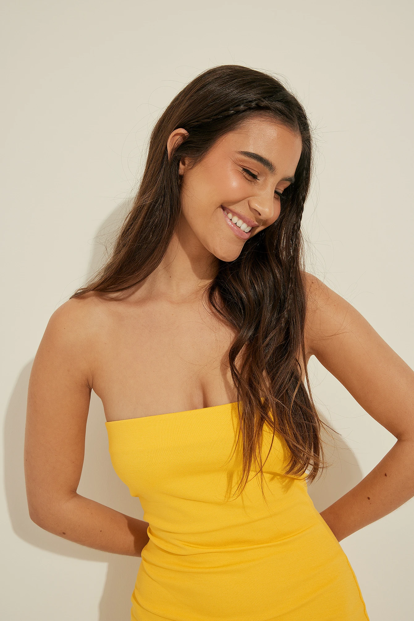 Cette robe courte est moulante et a un design à bandeau et une matière élastique.
