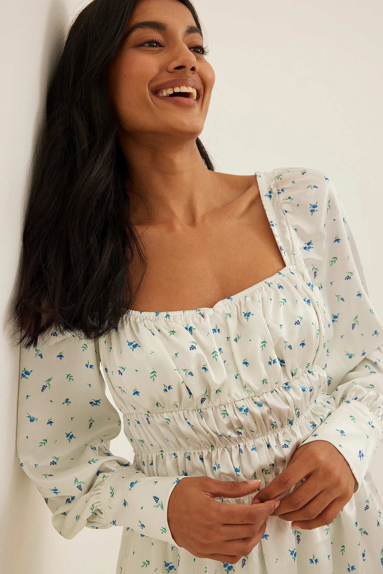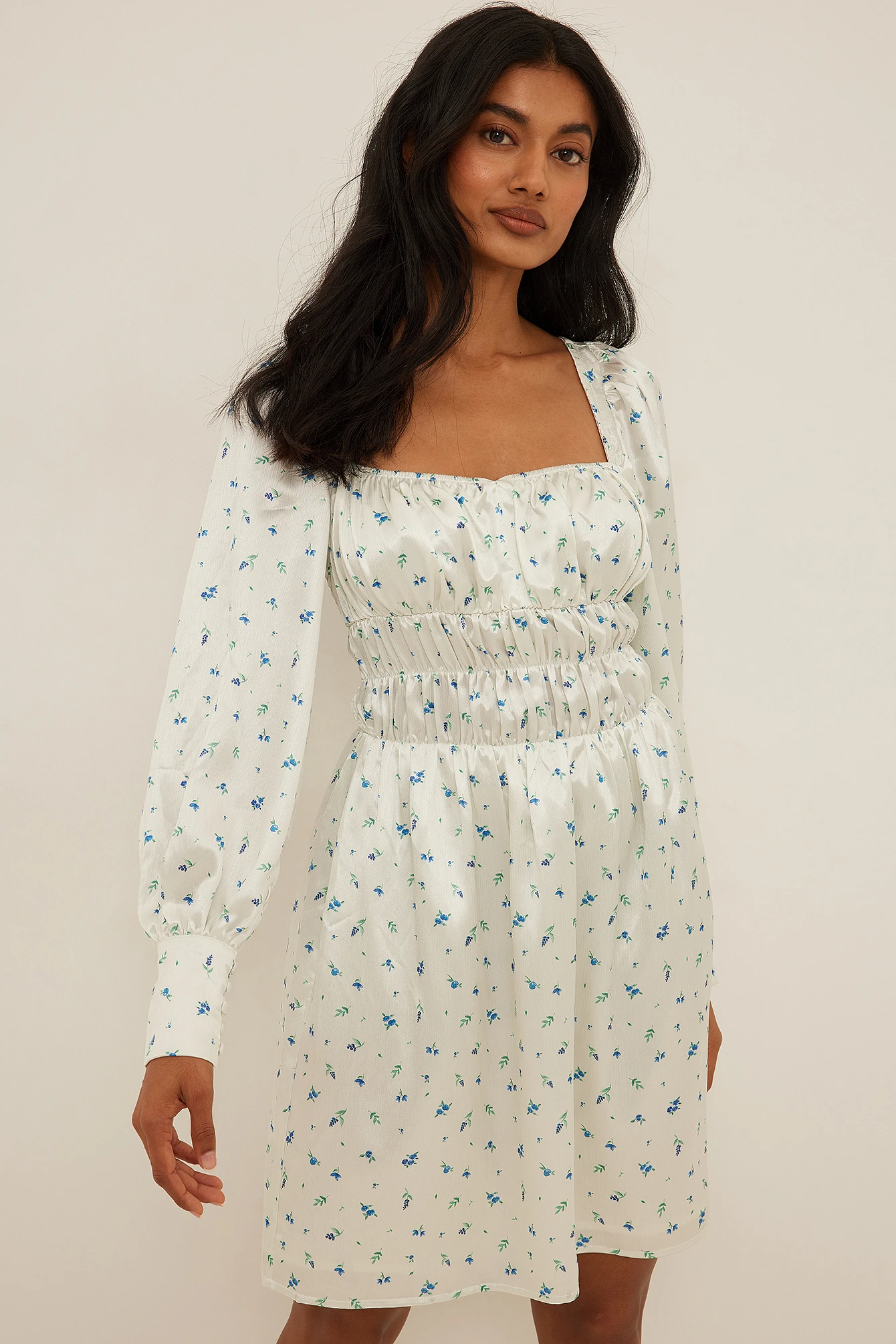 Cette robe courte est structurée et faite en satin et a un col carré élastique avec détail de bonnet. Elle a des manches longues bouffantes avec boutons de manchette et une ceinture élastique. Cette robe courte a un dos froncé.