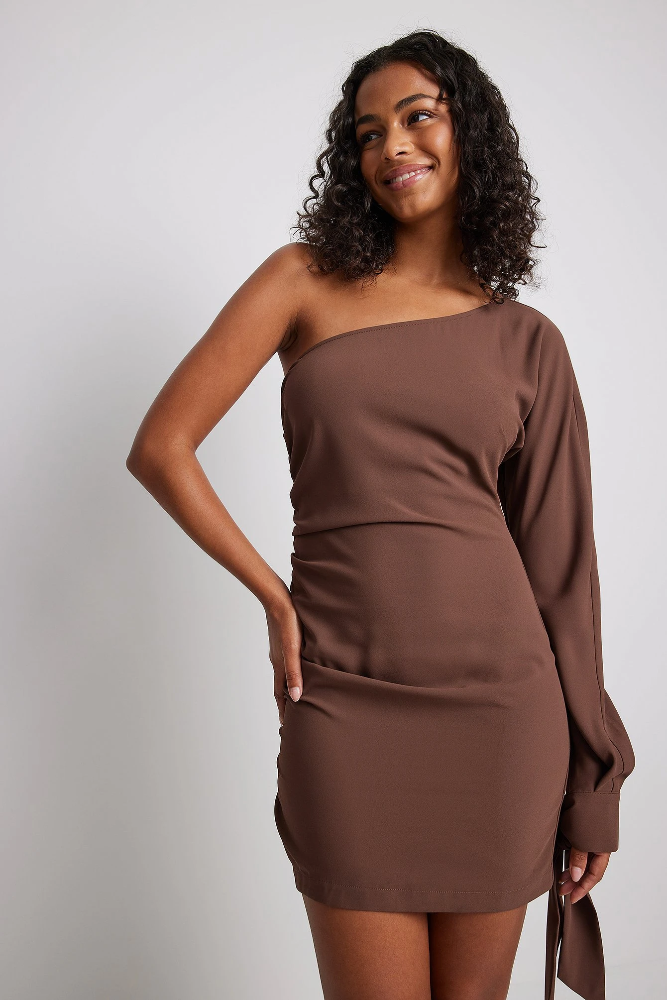 Cette robe courte a un design à une manche avec détail auto-sérré sur la manche, un détail drapé sur un côté et une fermeture éclair latérale.