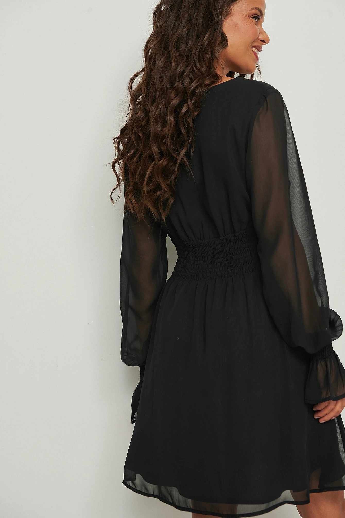 Cette robe courte a un col en V drapé, des manches longues froncées, une coupe fluide et taille marquée avec smocks.