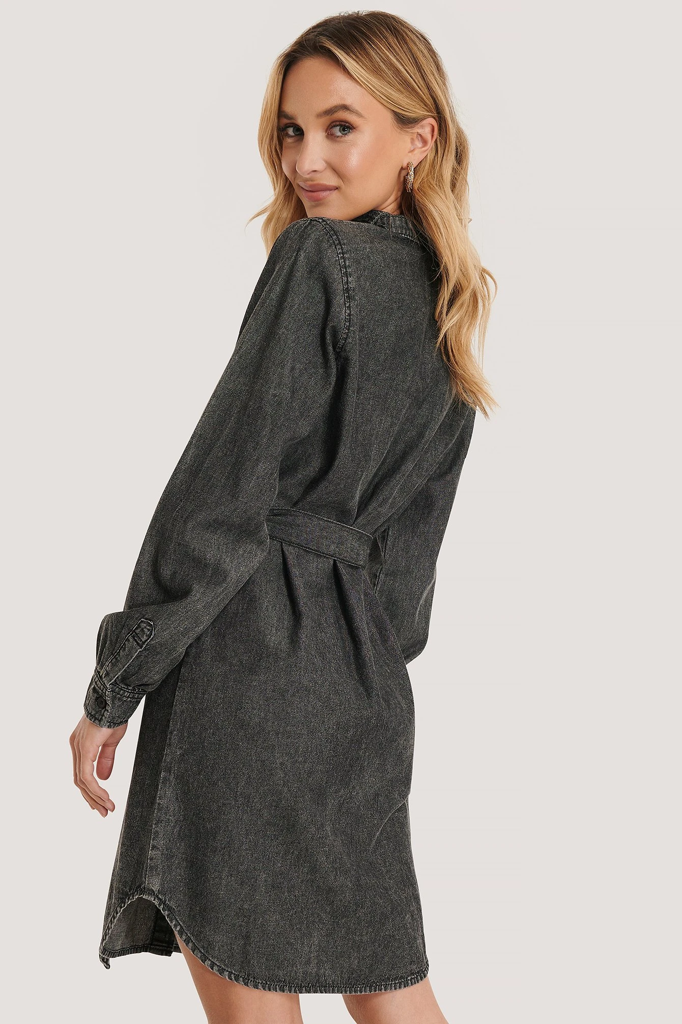 Cette robe courte a un col classique, des manches longues avec boutons de fermeture aux manchettes, une ceinture supplémentaire, des boutons de fermeture cachés à l’avant et de la matière en jean.