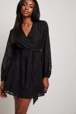 Cette robe courte a une encolure avec design chevauchant, des manches bouffantes longues et transparentes avec cordons réglables aux manchettes, une patte de serrage avec noeud à nouer et une matière structurée.
