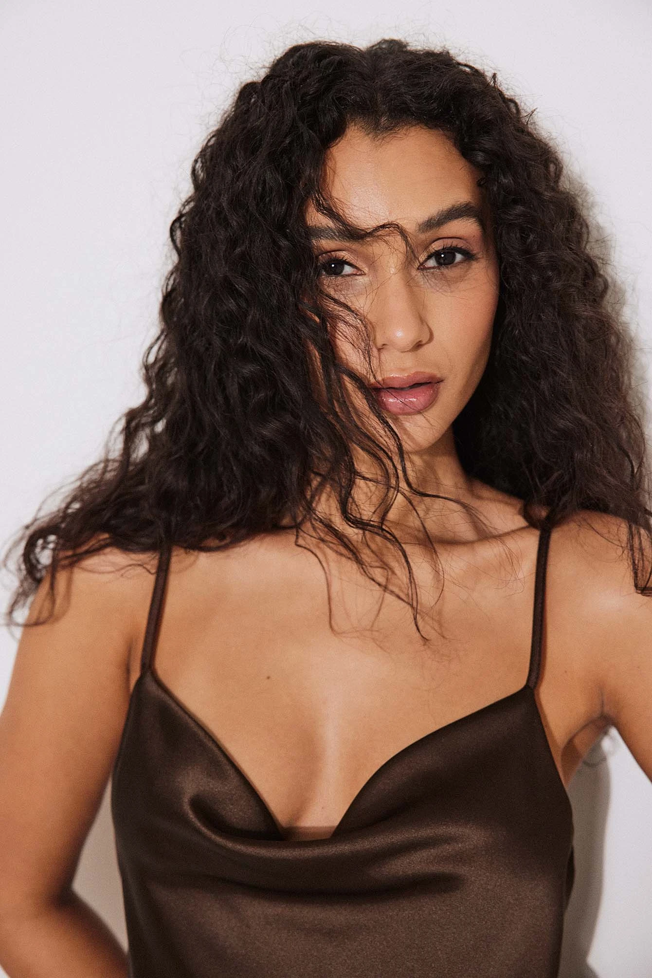 Cette robe a du satin. Elle a un col bénitier et des bretelles fines réglables. Cette robe a une coupe fluide et une taille courte.