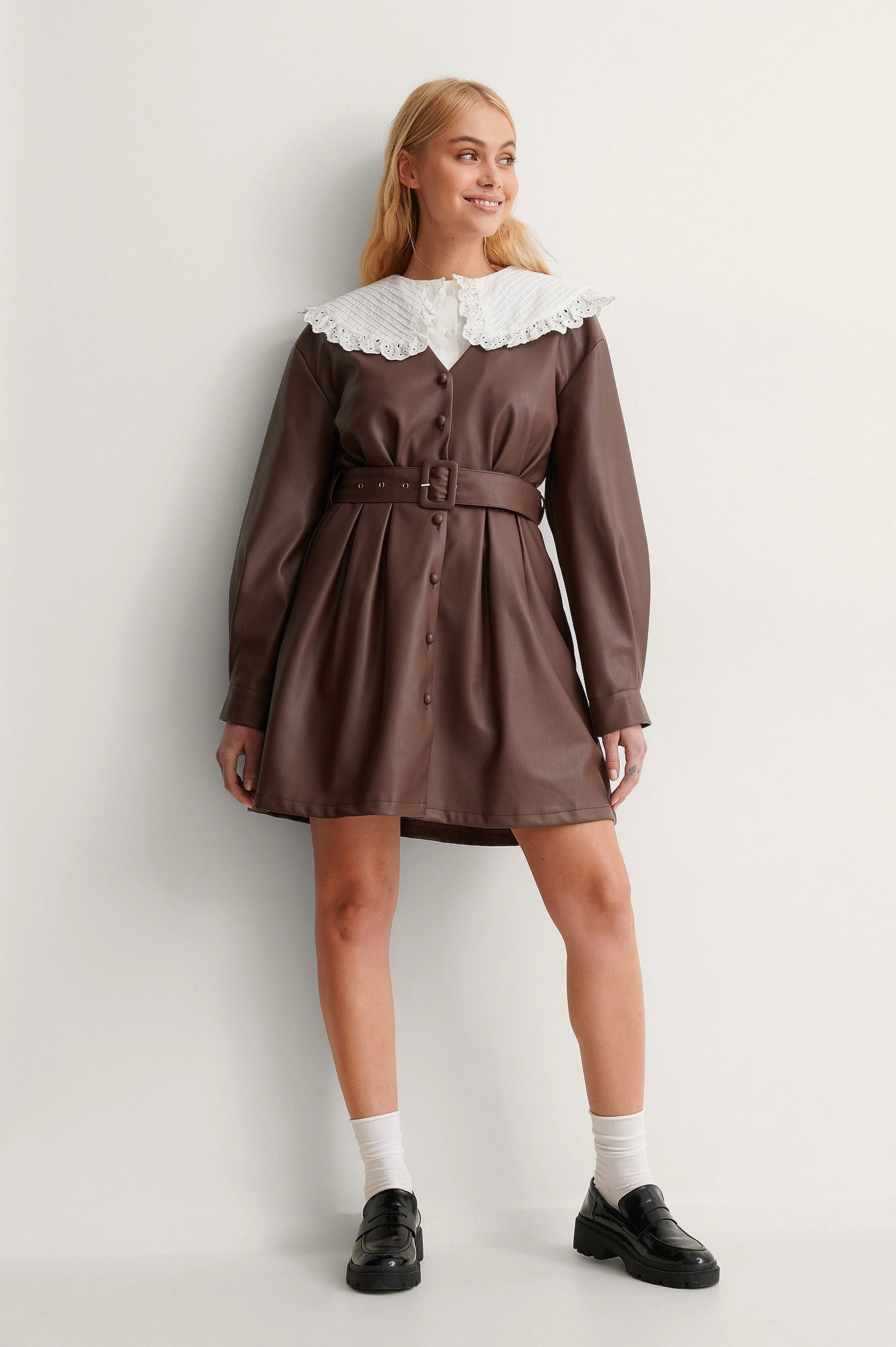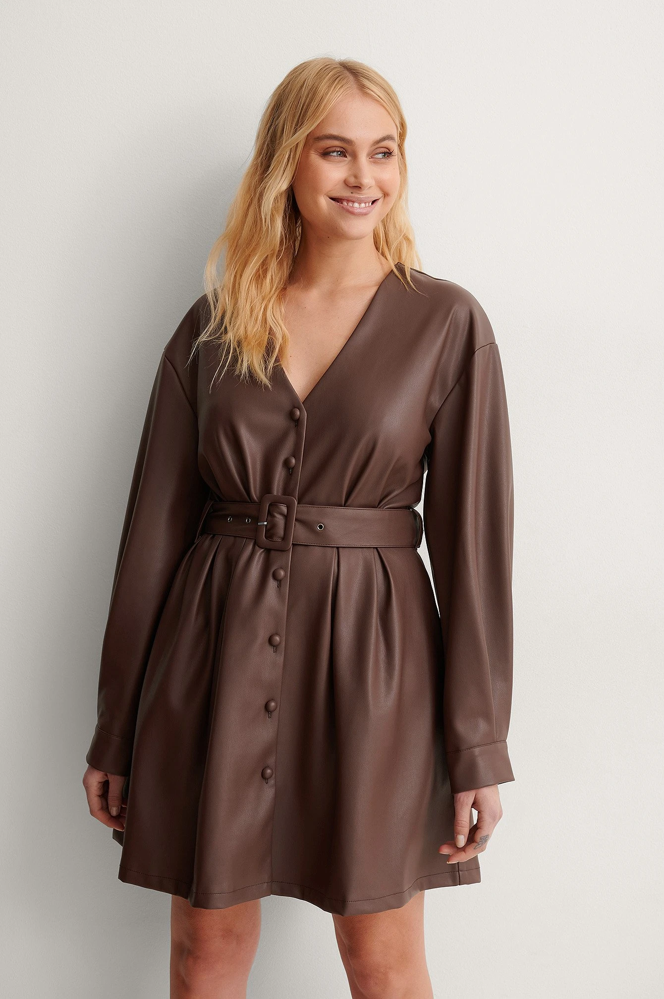 Cette robe a un col en V, des manches longues, des boutons de fermeture tout le long, une ceinture réglable et amovible avec boucle de fermeture, une matière en PU, une taille courte et une coupe fluide.