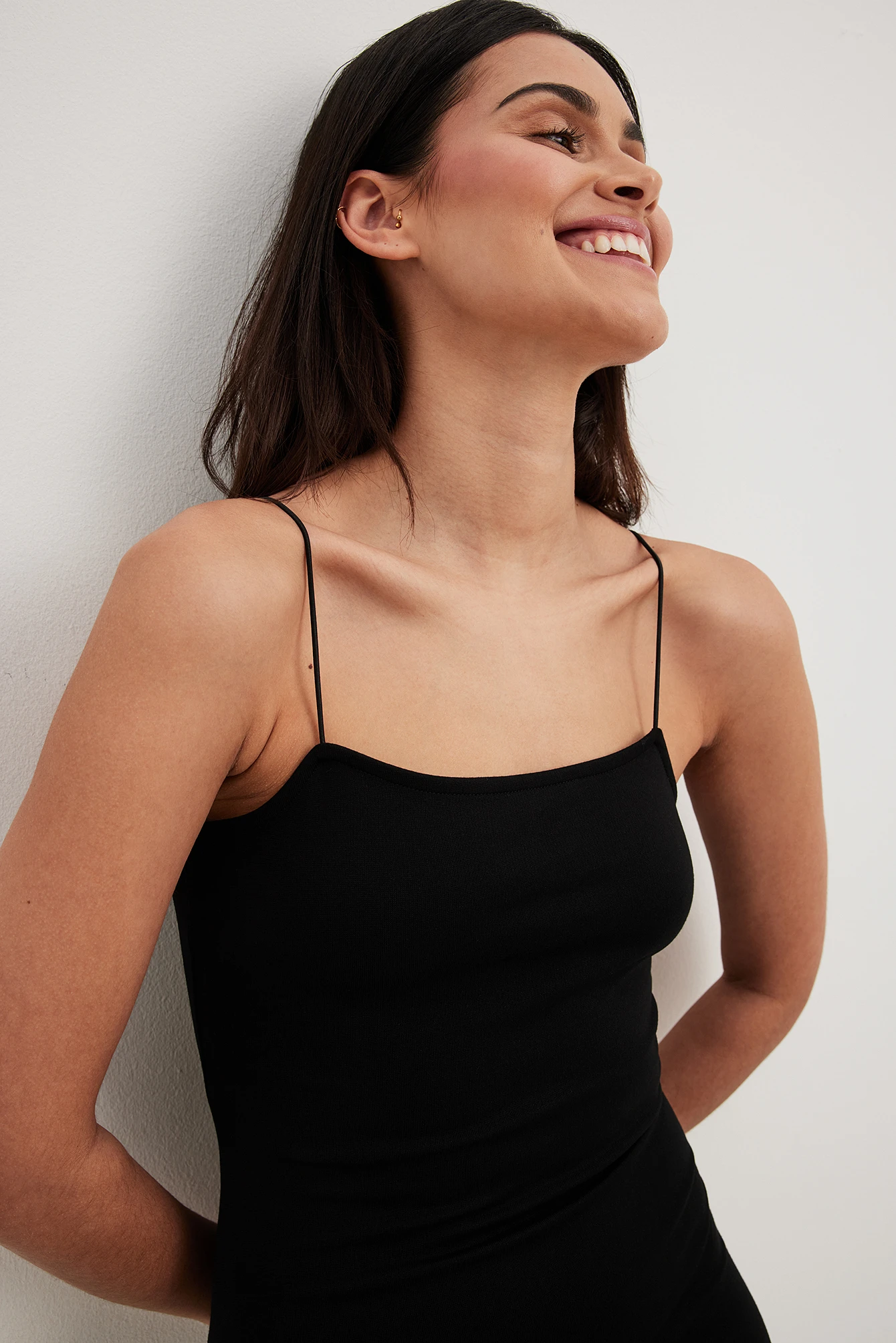 Cette robe a une coupe moulante et une matière élastique. Elle a un col carré, des bretelles fines et une taille courte.