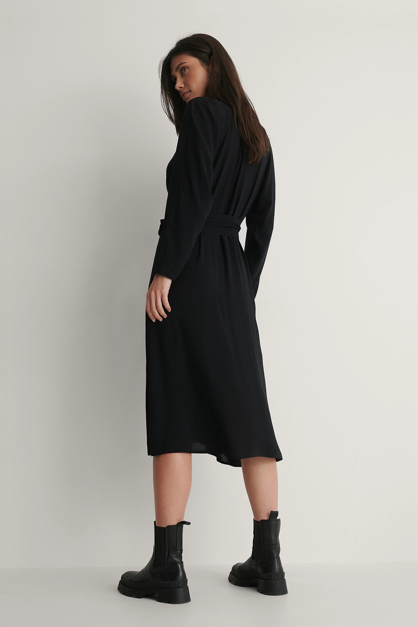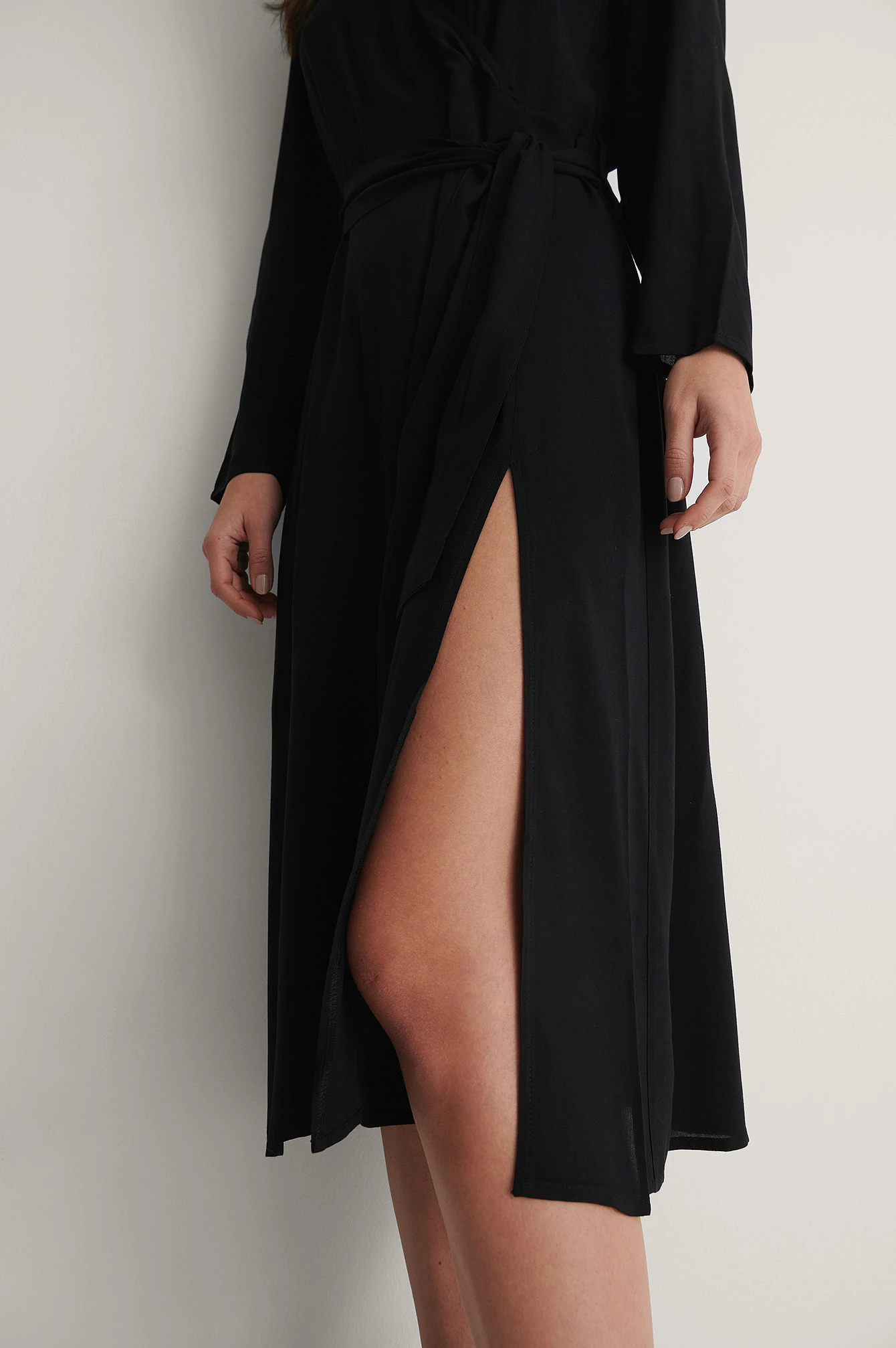 Cette robe midi a un design chevauchant, un détail de taille ajustable, des manches longues avec coupe kimono, un détail fendu sur l’ourlet bas et une coupe fluide.