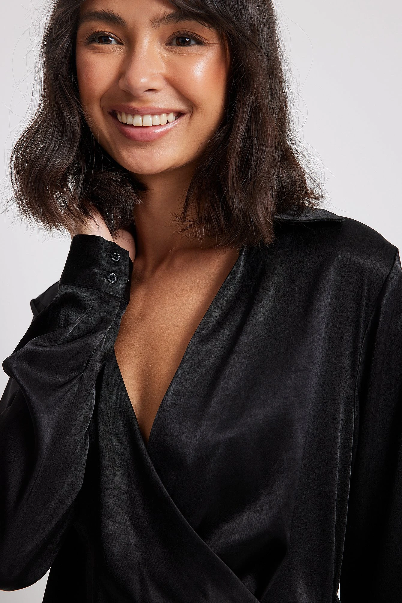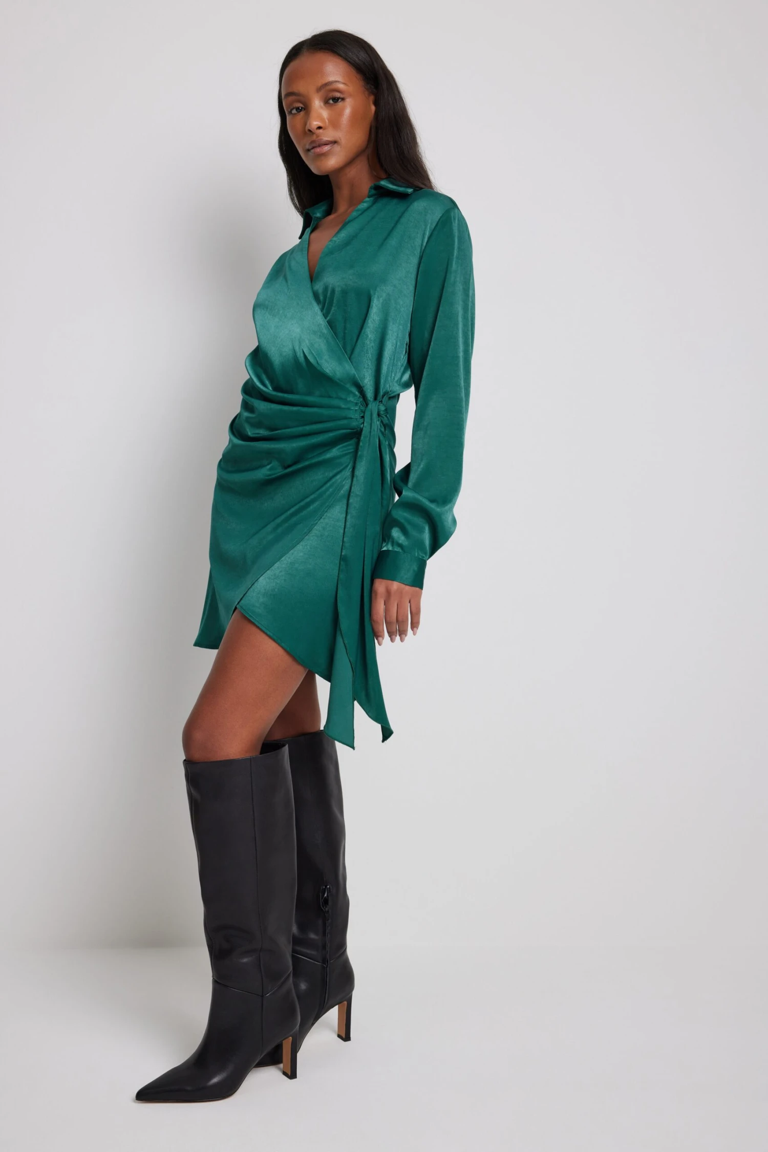 Cette robe a un col avec col en V, un design chevauchant plissé avec noeud de bretelles réglable, des boutons de manchette, une taille courte et une matière semblable à la soie douce.