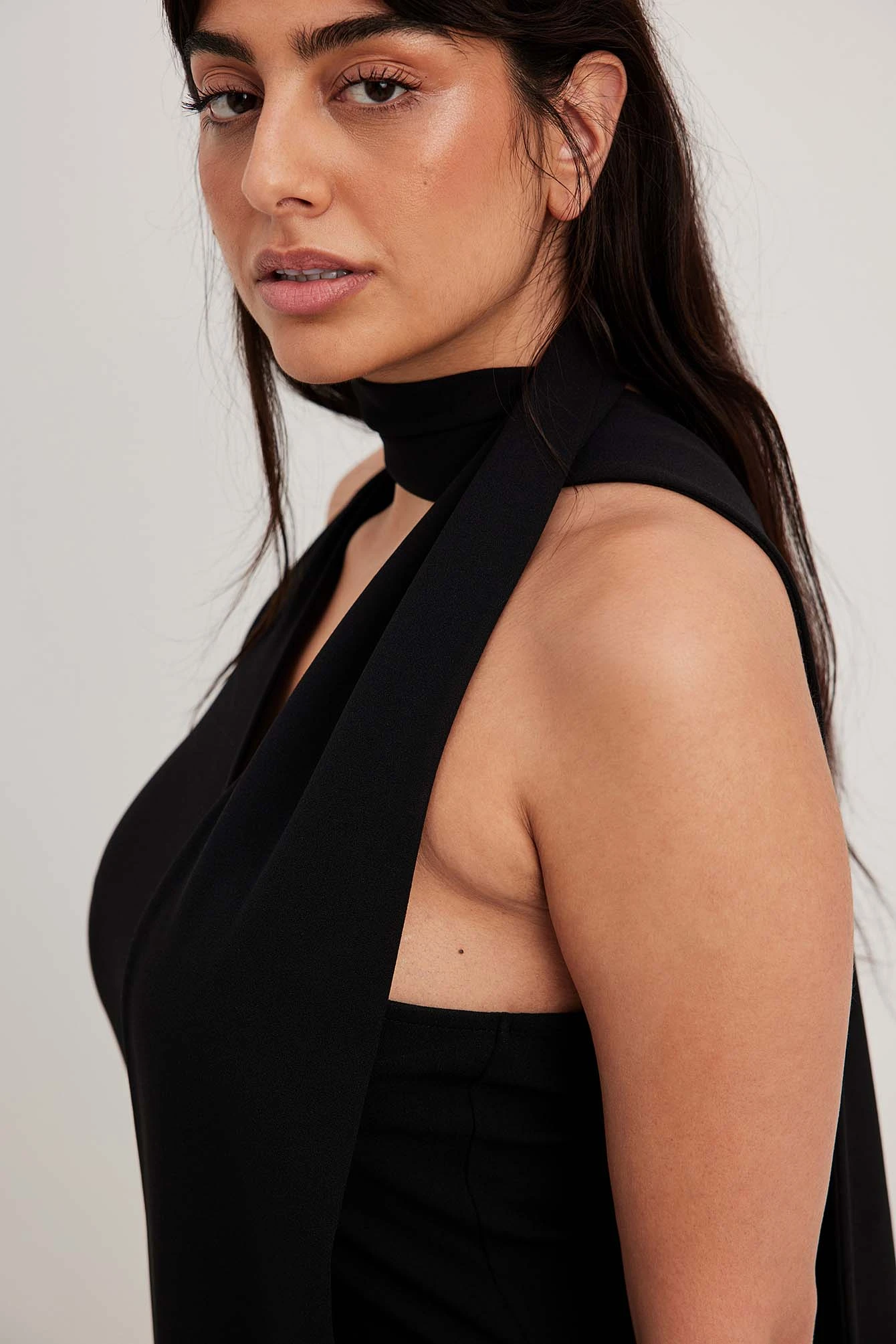 Cette robe courte est faite en jersey et a une détail d’écharpe. Elle a une matière élastique.