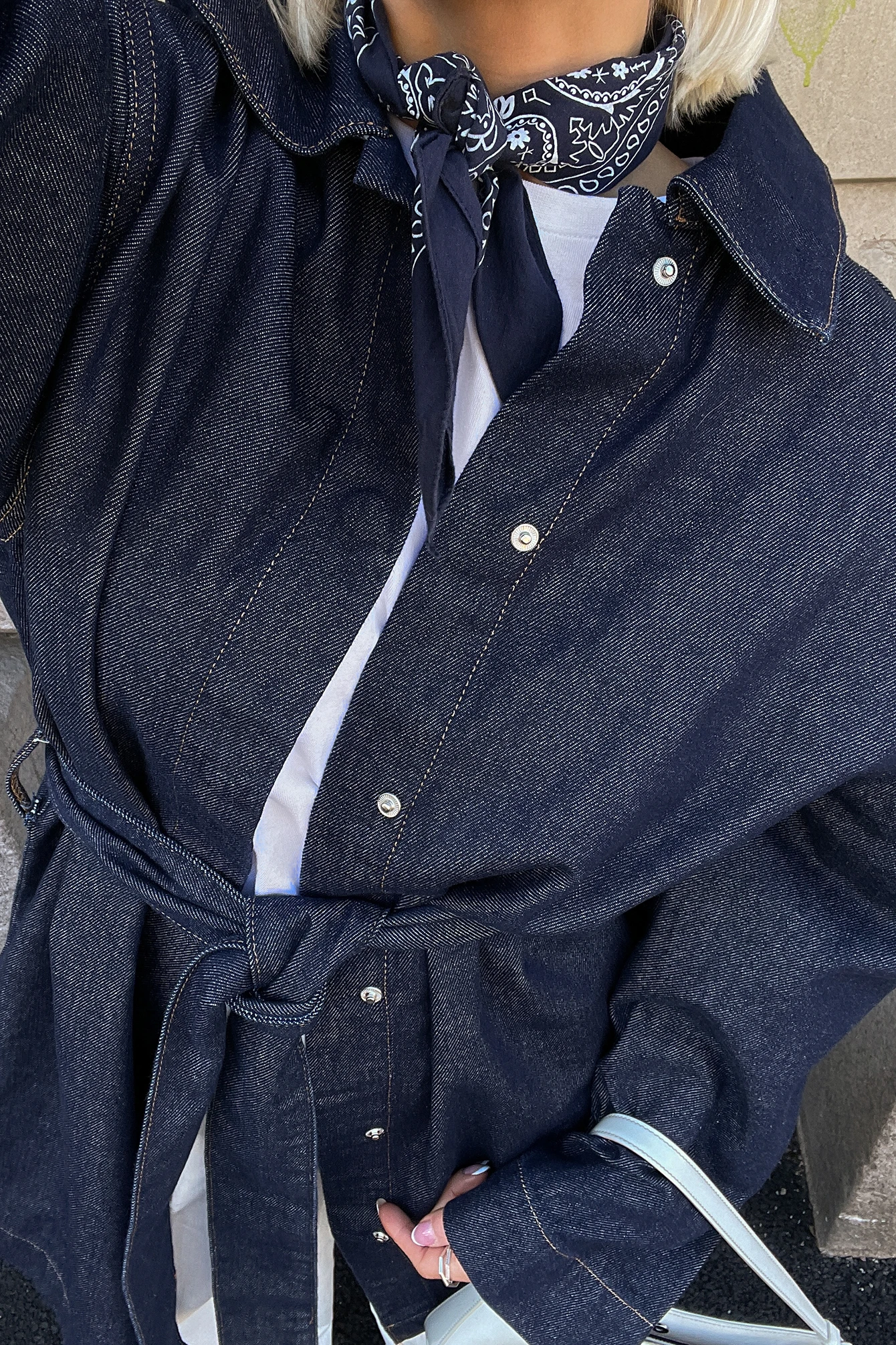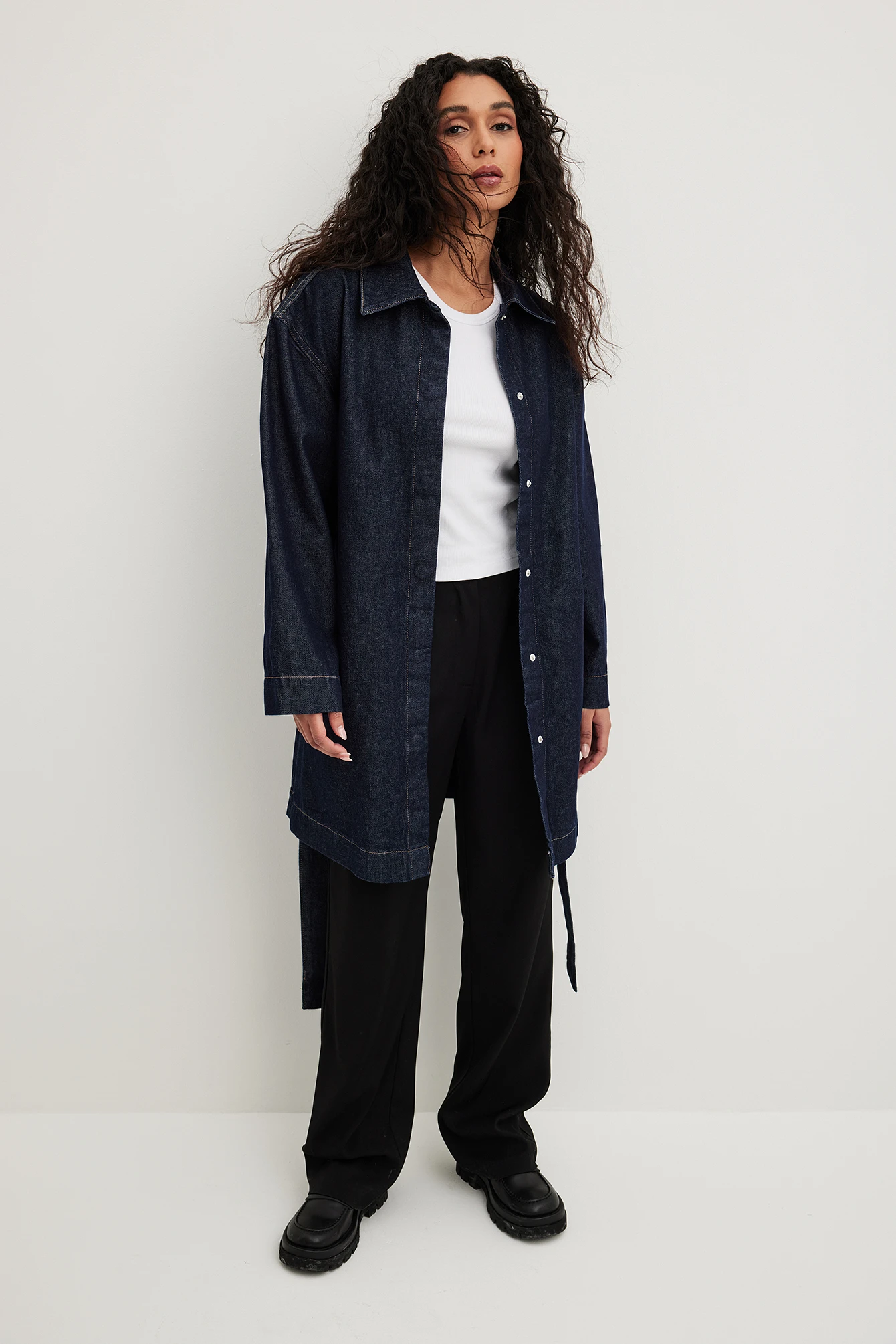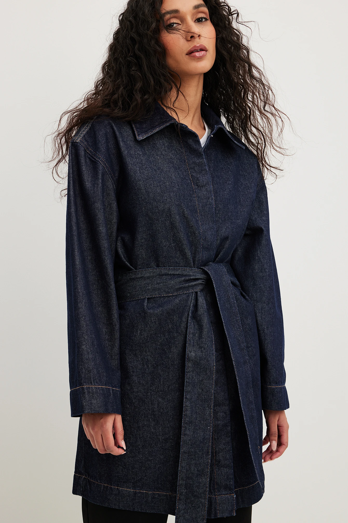Cette robe courte est faite en denim et a un col classique. Elle a des manches longues et bouton-pression caché à l’avant. Cette robe courte a une ceinture ajustable.