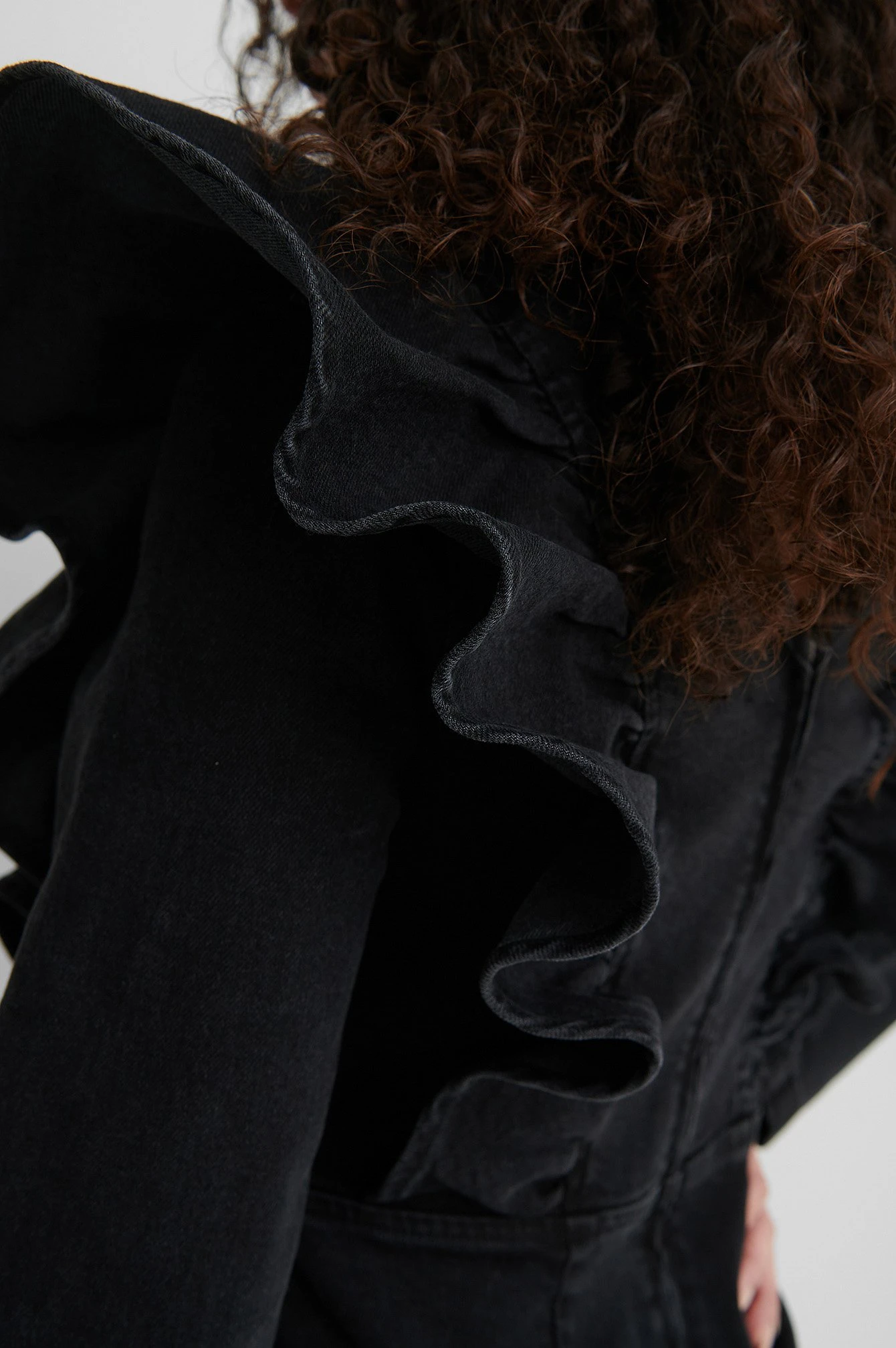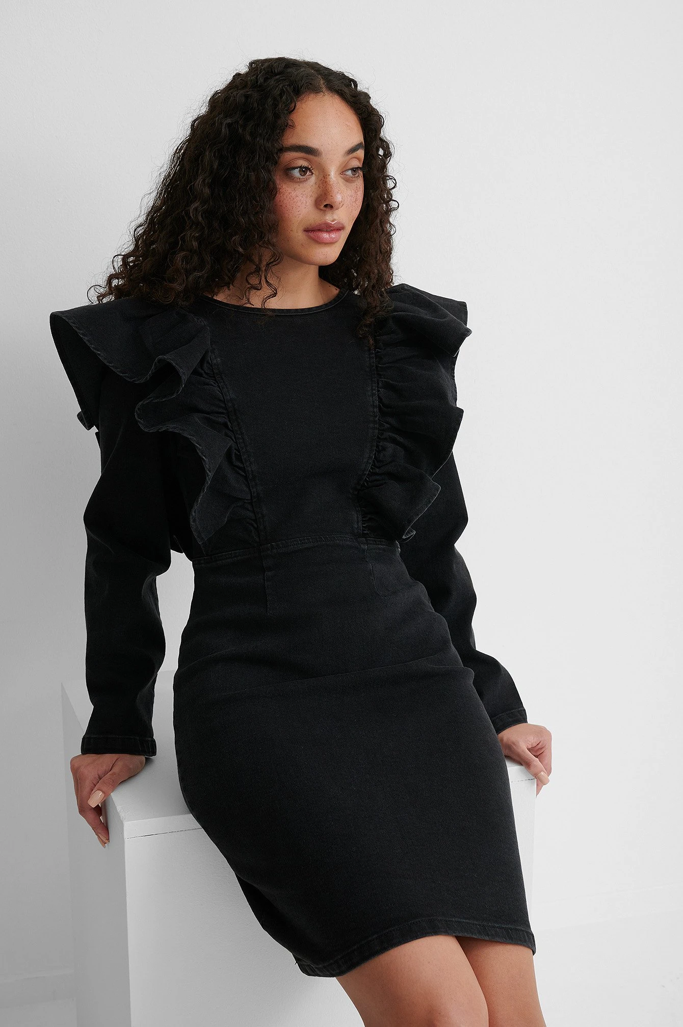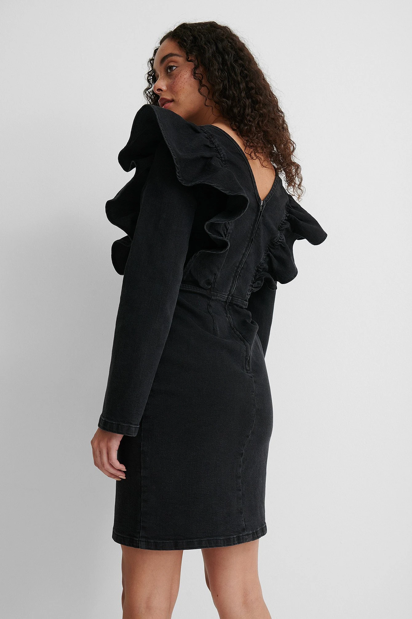 Cette robe est faite en denim et a un col en V avec fermeture éclair et détails volantés sur la moitié haute. Elle a des longues manches et des détails de couture. Cette robe a une jupe trapèze, une coupe décontractée et une taille courte.