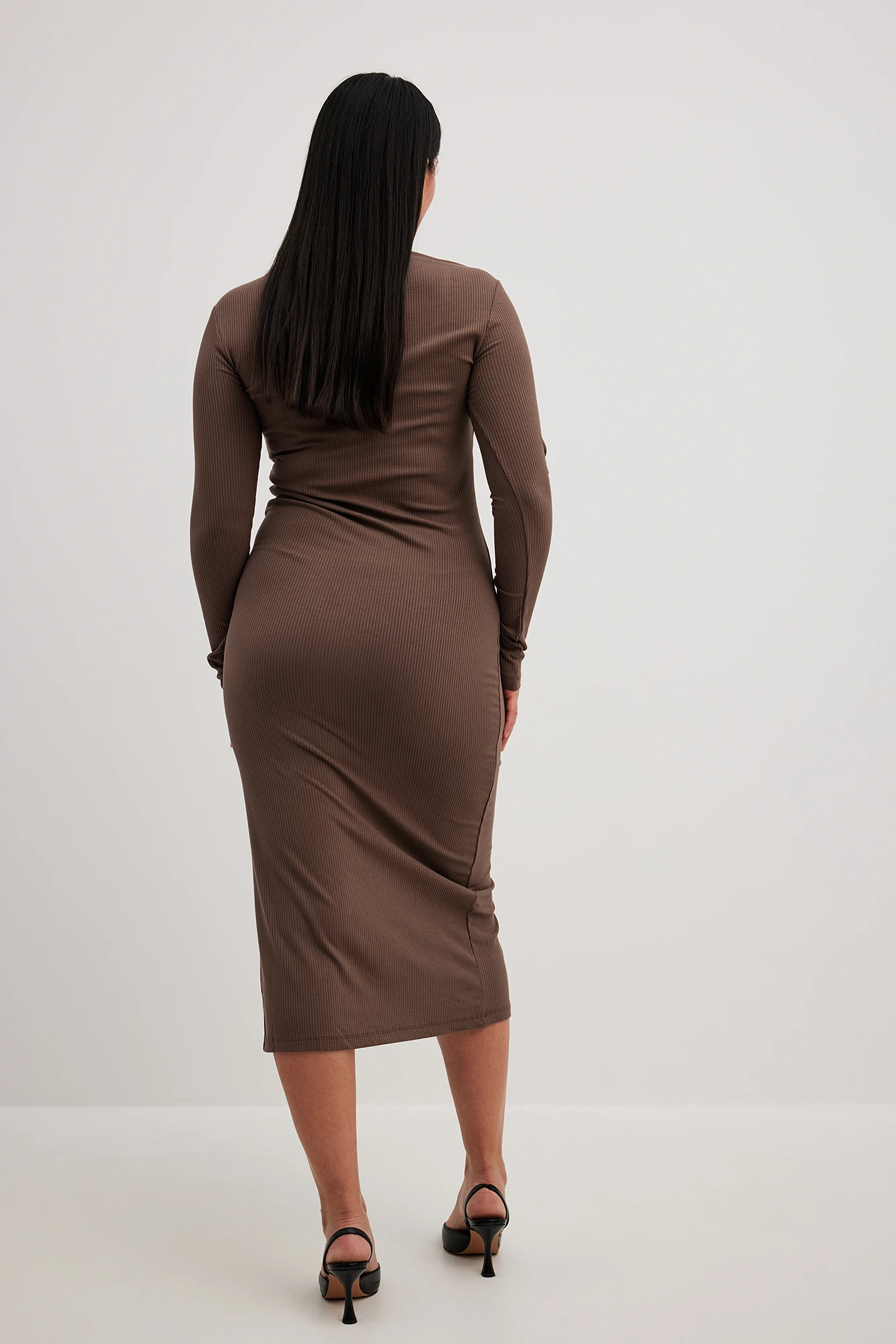 Cette robe a des manches longues. Elle a une taille longue et un col carré. Cette robe a un ourlet avec détail fendu et une matière élastique et doublée de jersey à nervures.