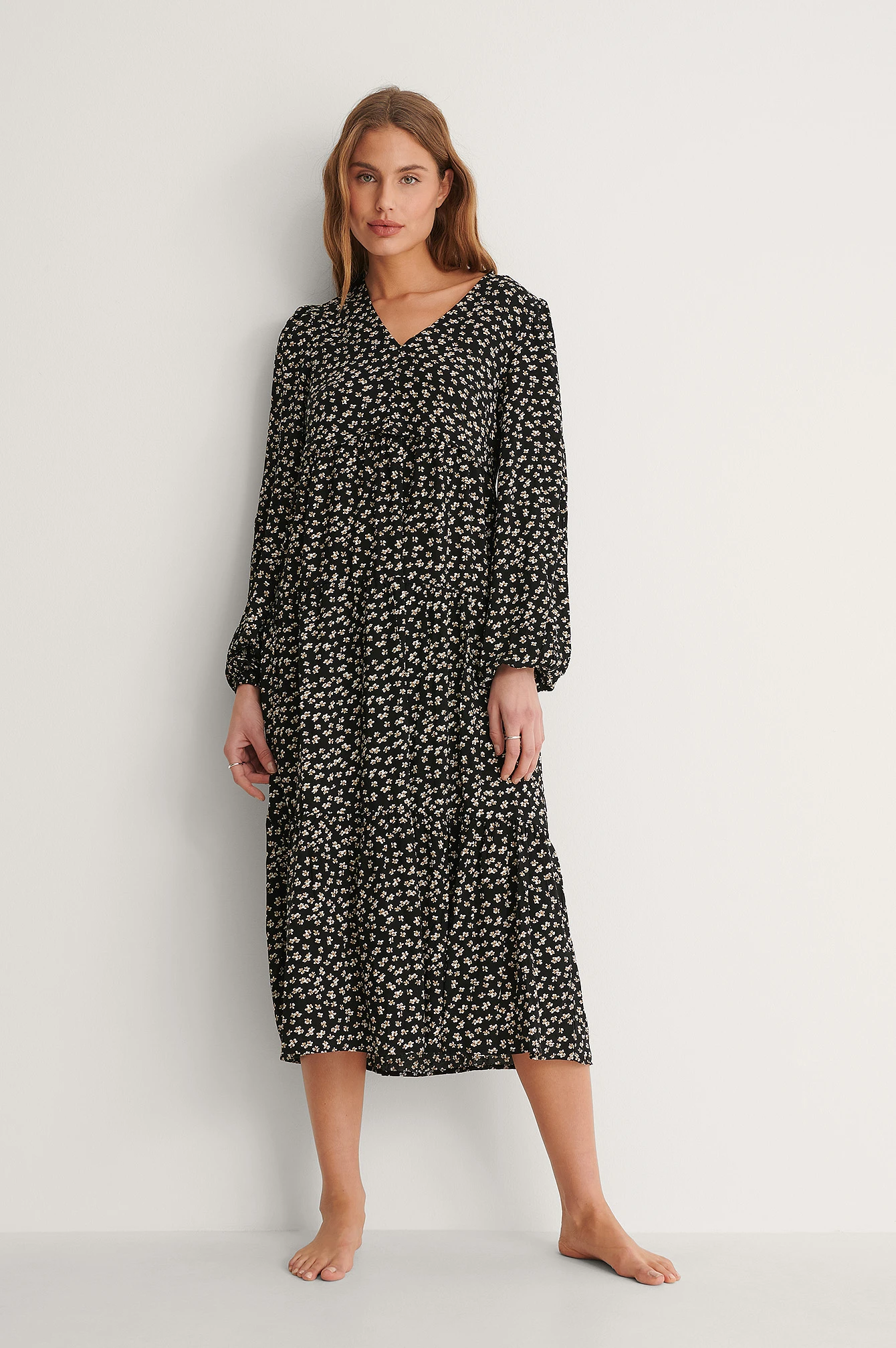Cette robe longue a un col en V. Elle a des manches longues et un détail à volants sur la poitrine. Cette robe longue a des élastiques sur les manchettes.