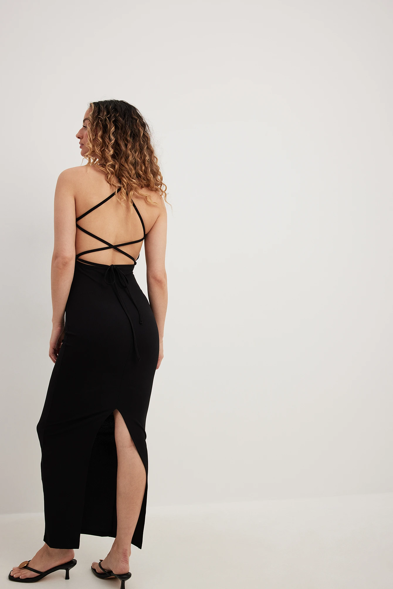 Cette robe longue a des bretelles fines. Elle a un design à dos ouvert et un détail auto-sérré réglable à l’arrière. Cette robe longue a un détail fendu arrière et une matière élastique.