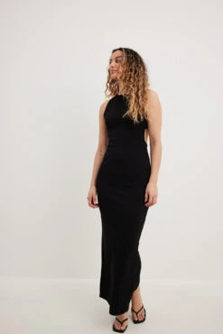 Cette robe longue a un col arrondi. Elle a des bretelles croisées à l’arrière et un design à dos ouvert. Cette robe longue a un détail fendu arrière et une matière élastique.