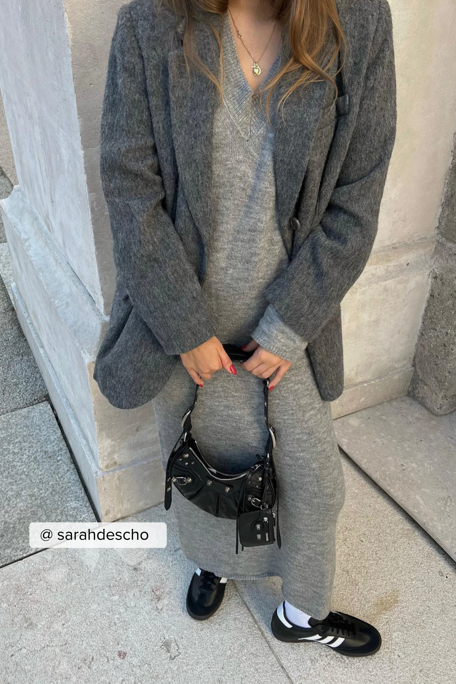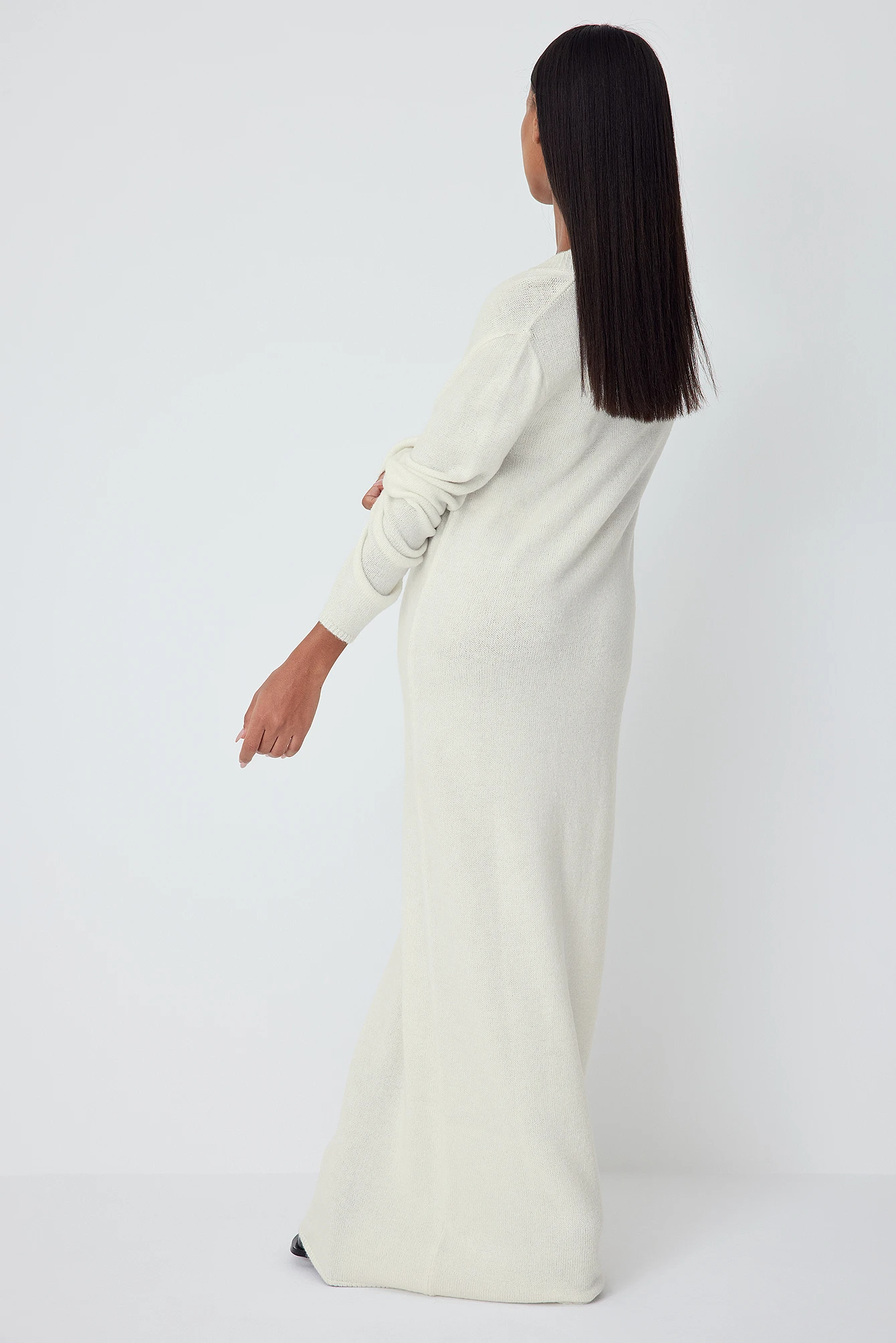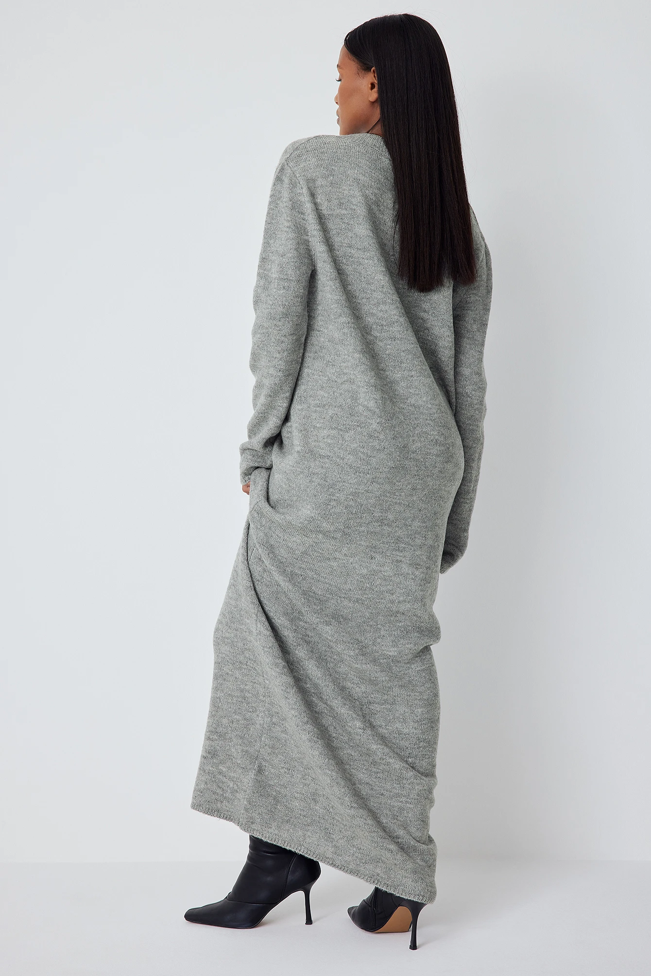 Cette robe longue est col en v et tricotée et a des manches longues et une coupe confortable.