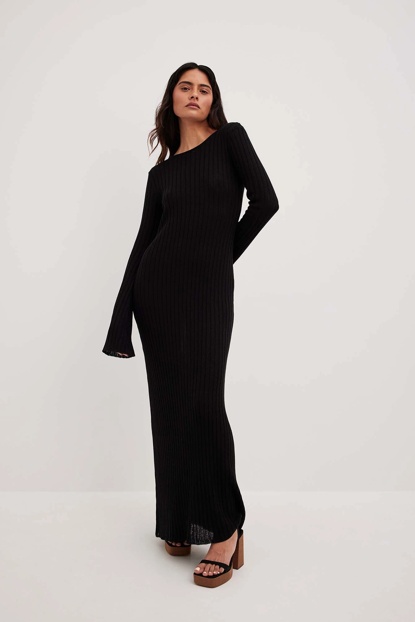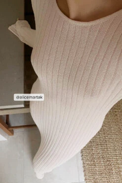 Cette robe longue est ajustée et a un tissu tricoté et un design avec une coupe trapèze. Elle a un col haut avec décolleté dos légèrement et des longues manches pagode.