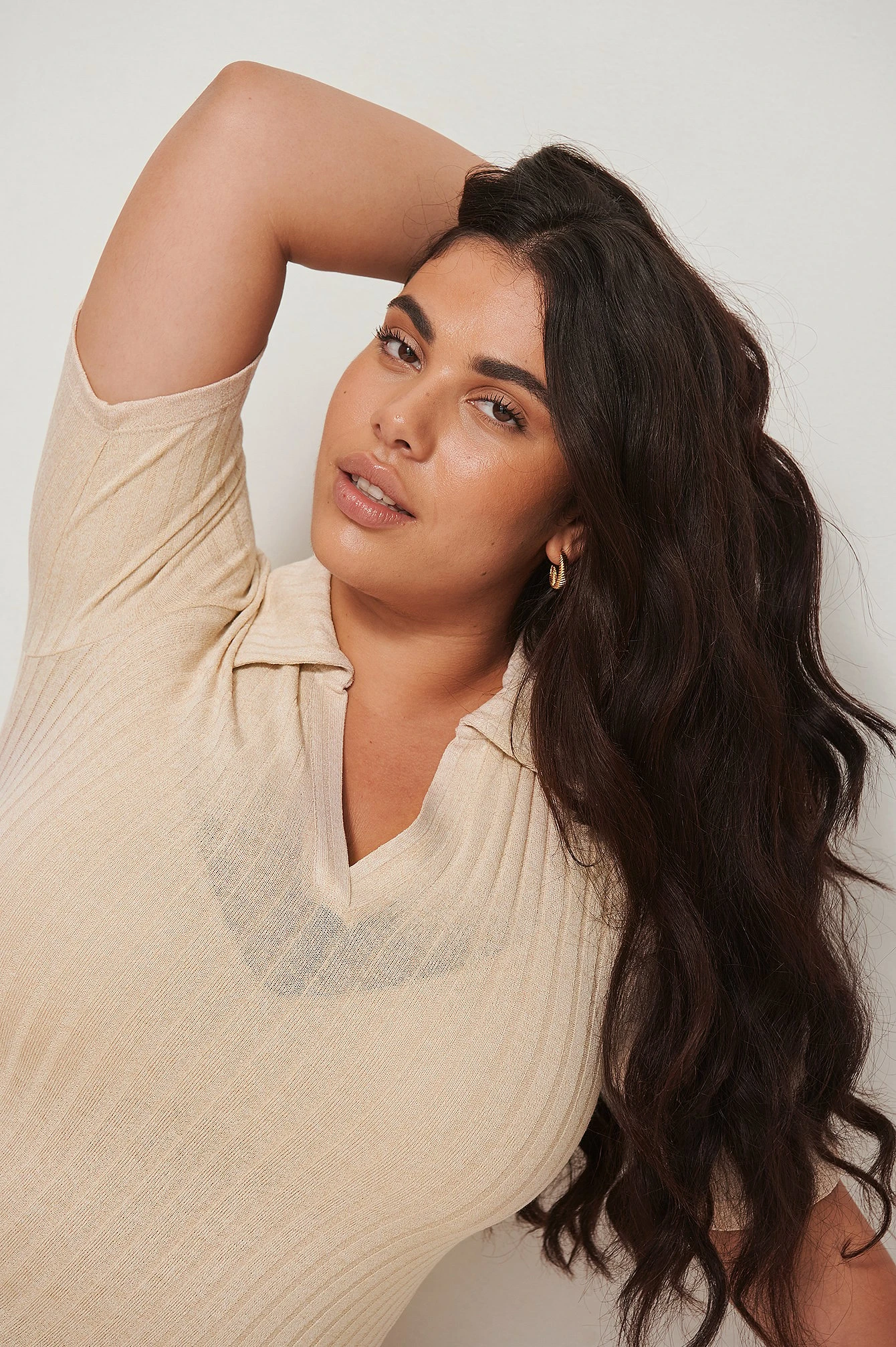 Cette robe midi a un col classique, des manches courtes et un design à côtes.