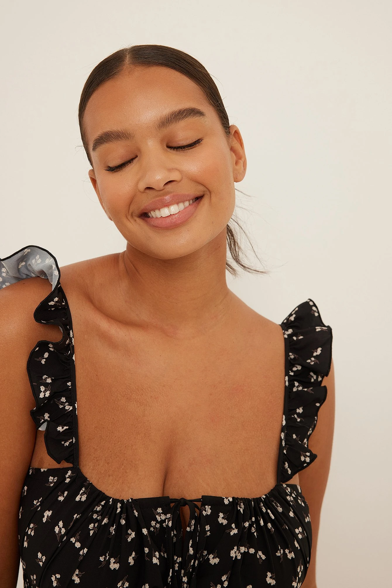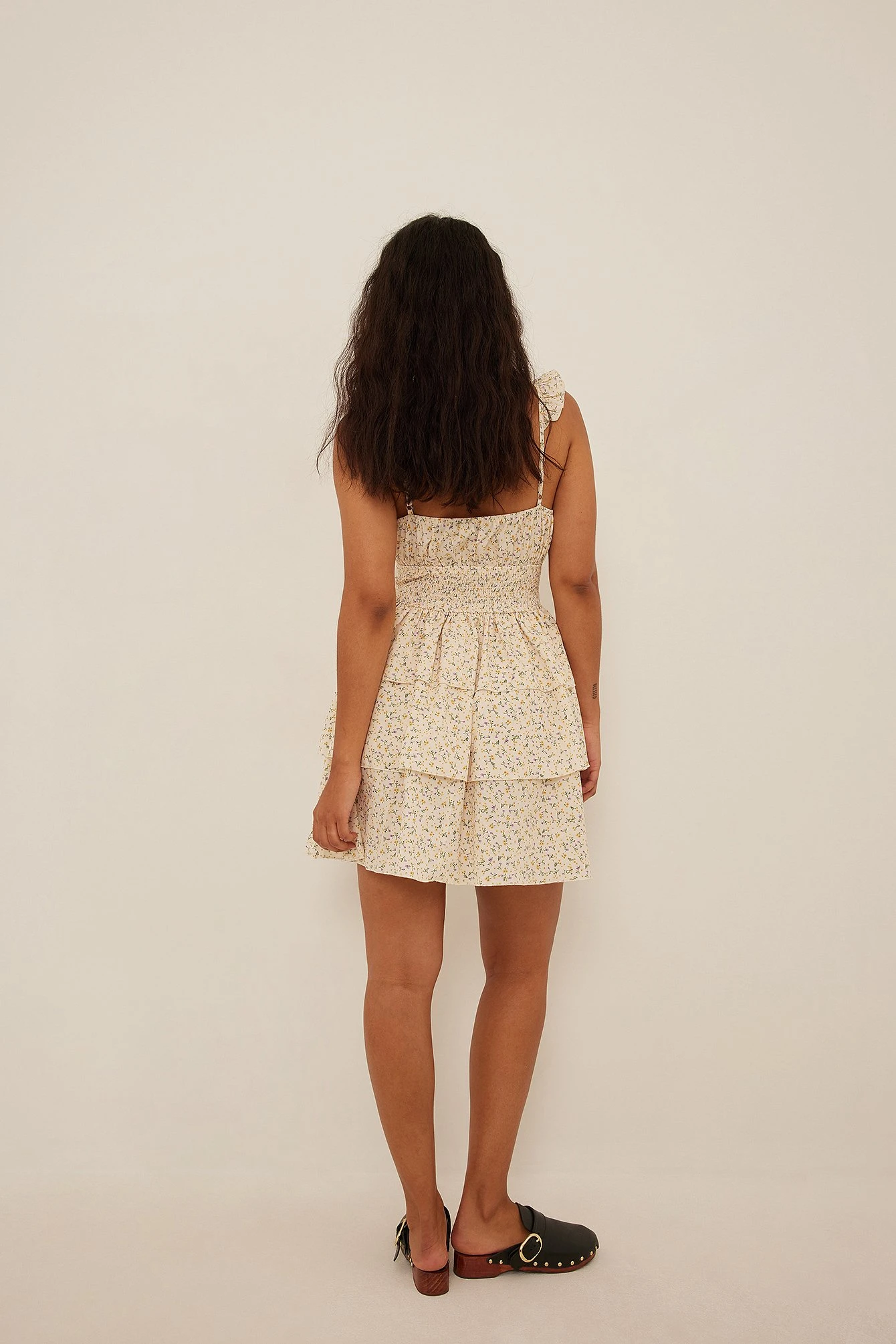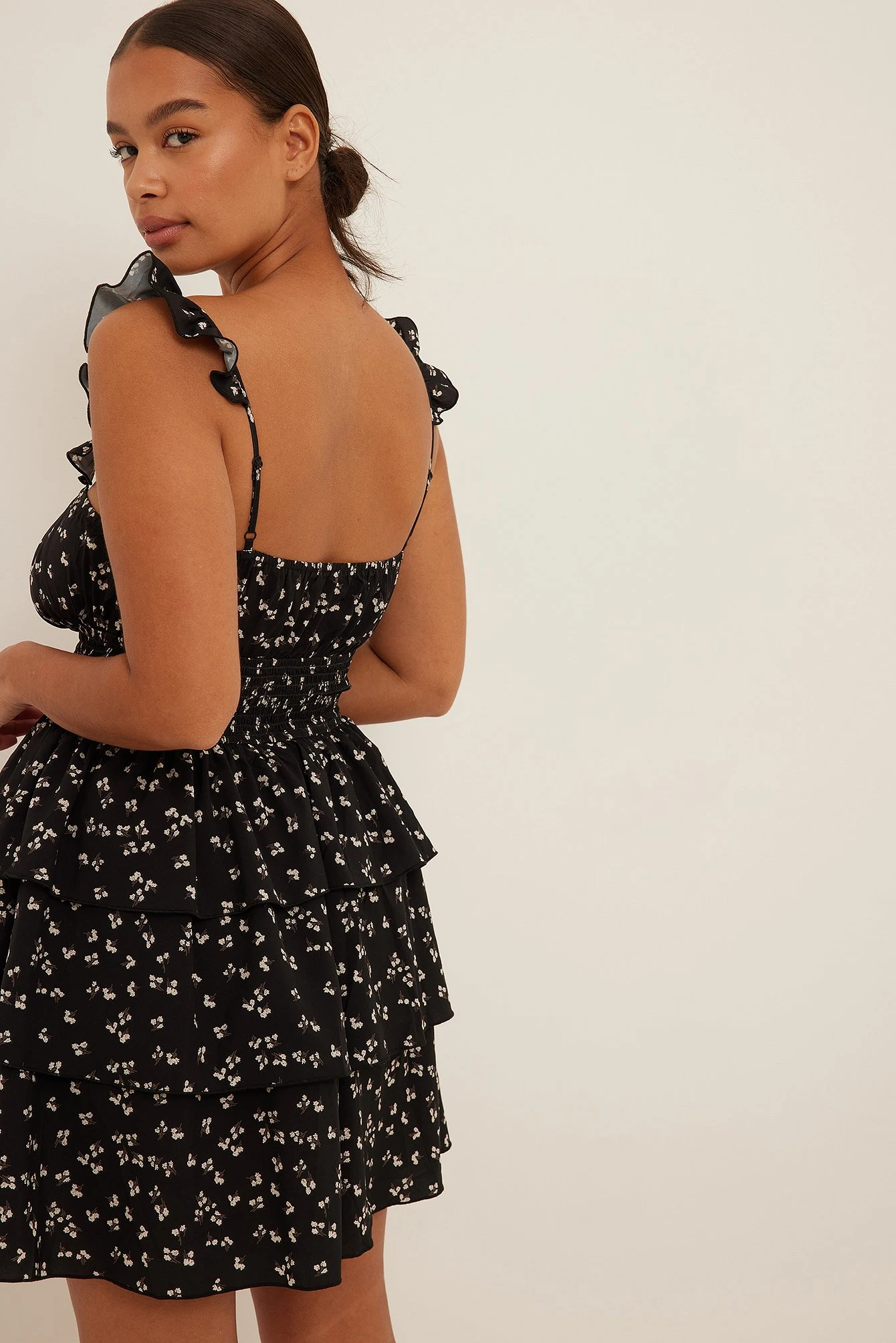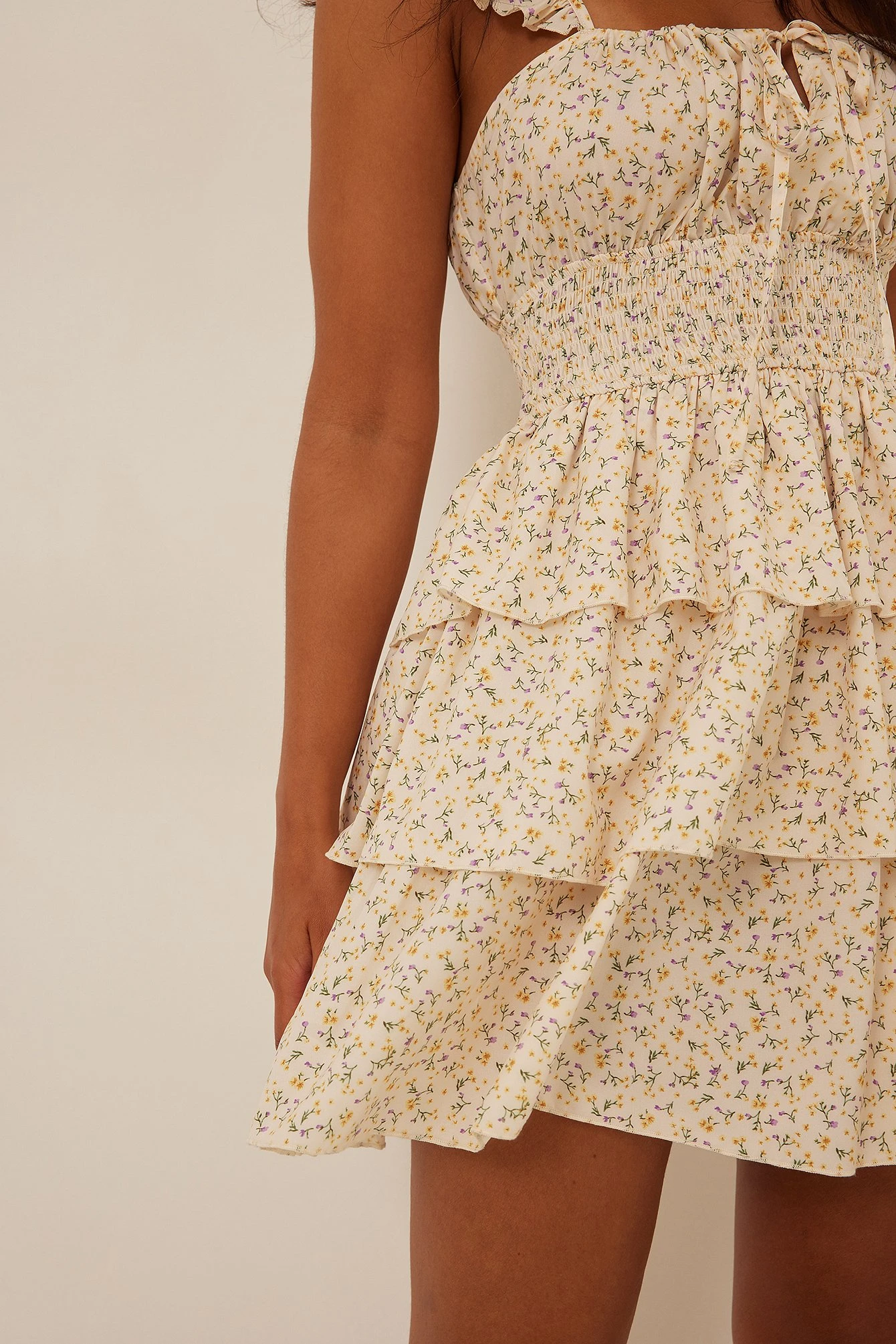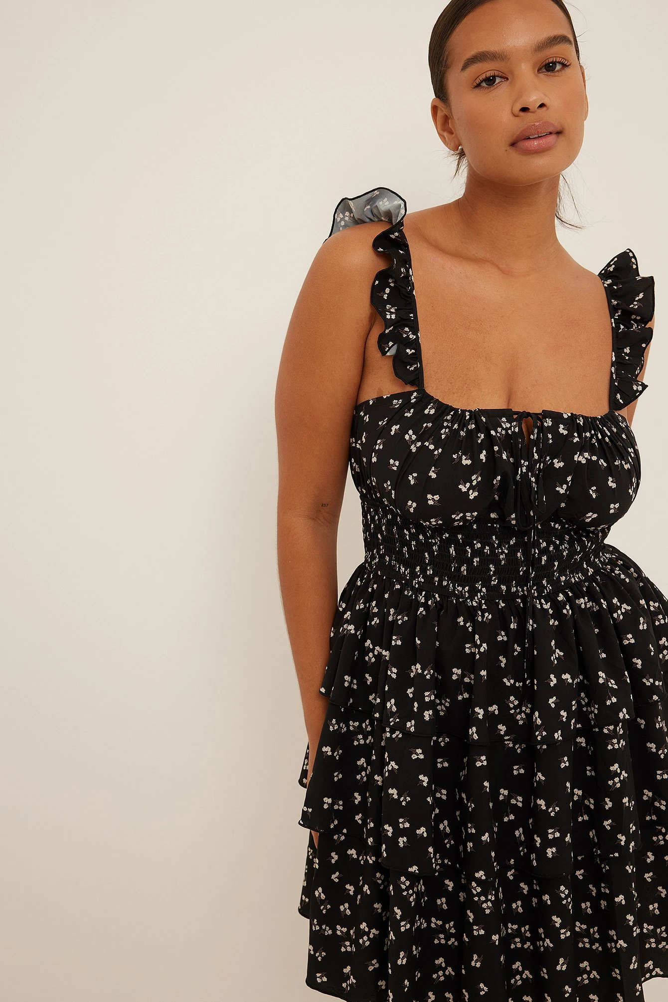 Cette robe courte est sans manches et a des bretelles ajustables avec froissement, un détail auto-sérré sur la poitrine et une jupe avec design superposé.