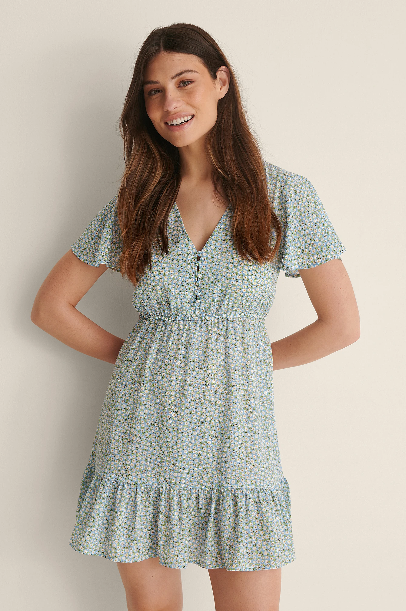 Cette robe a un col en V, des manches courtes, des boutons de fermeture à l’avant, une ceinture élastique, un détail volanté au bas, une taille courte et une coupe fluide.