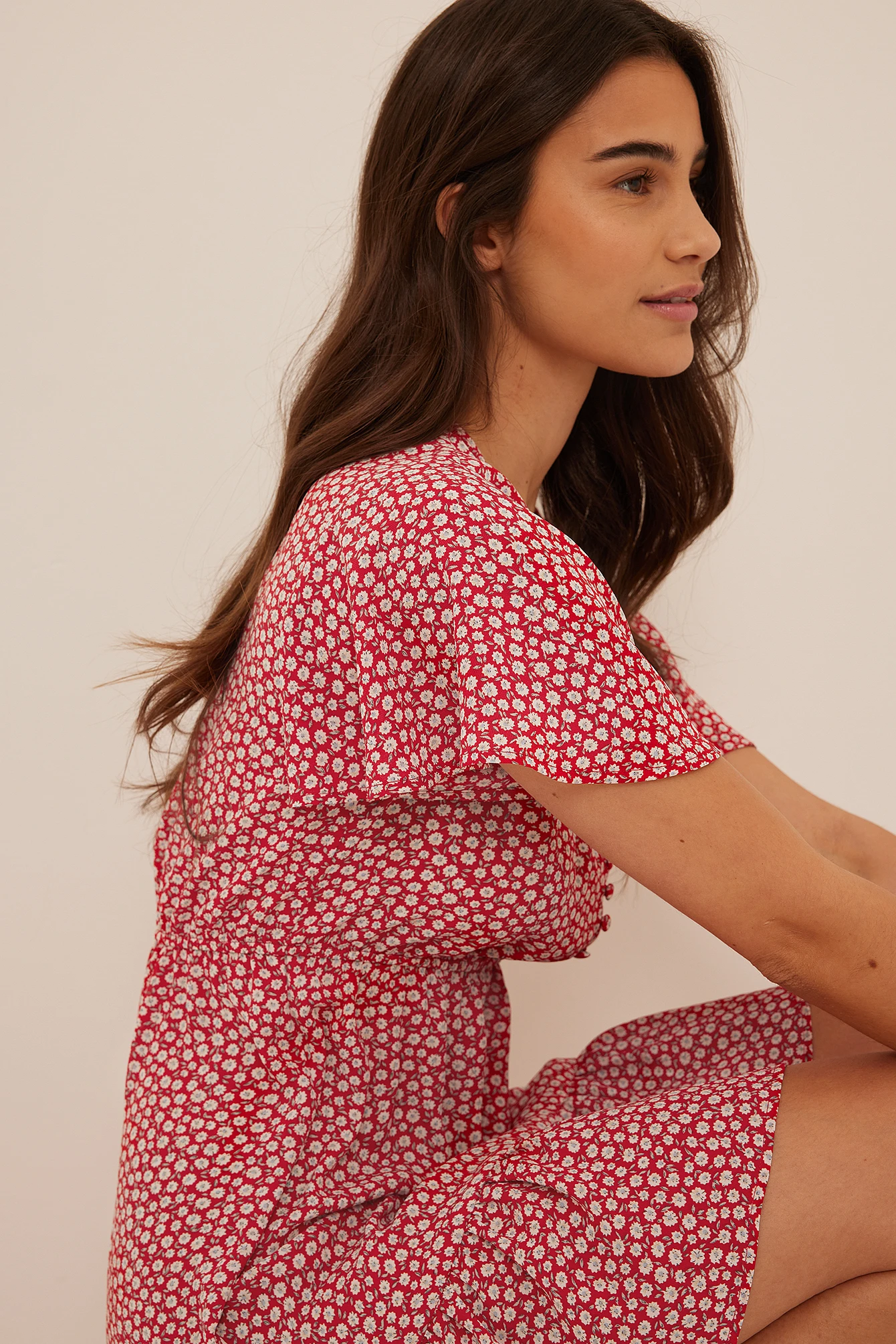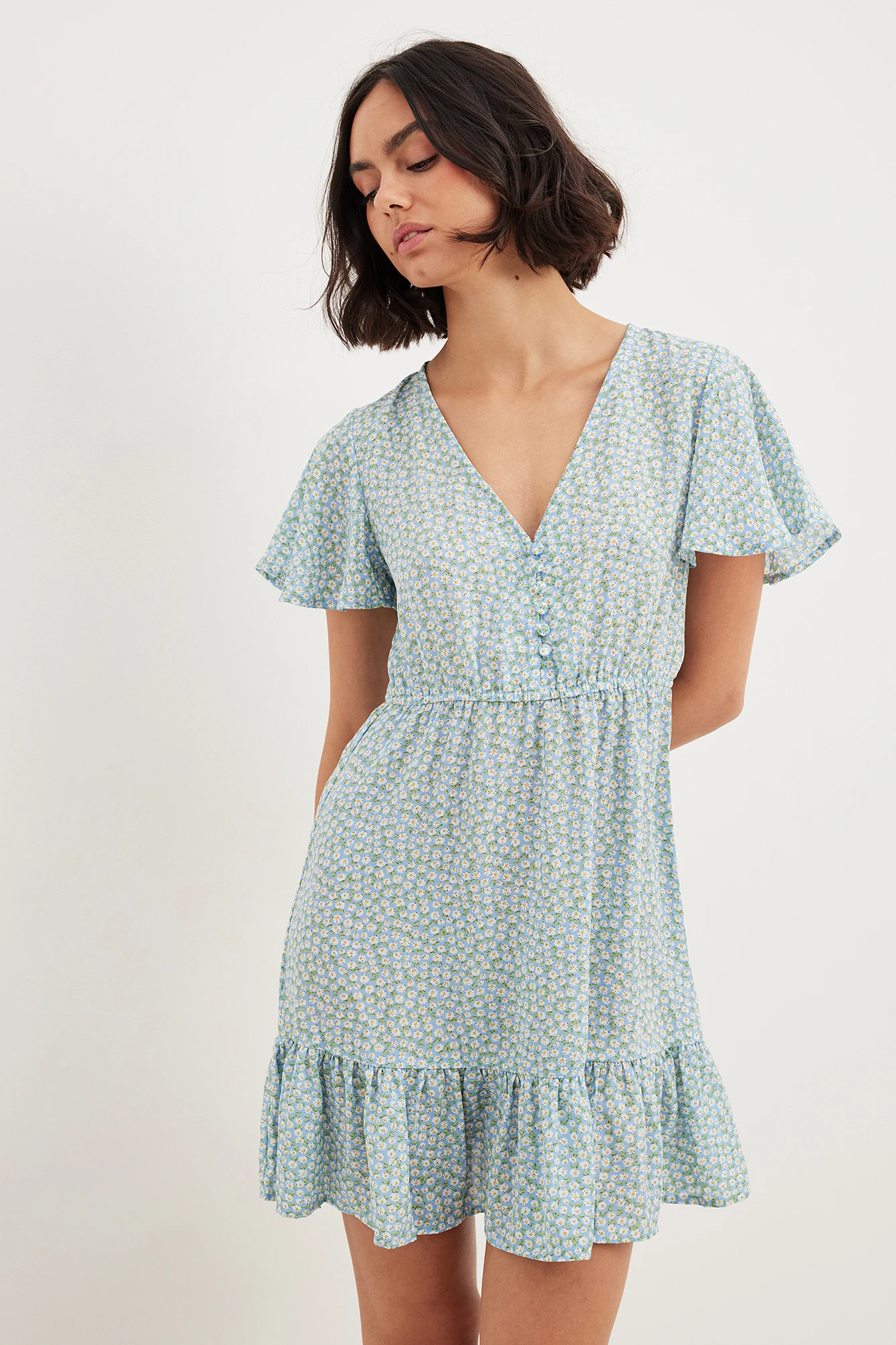 Cette robe courte a un col en V, des boutons à l’avant, une ceinture élastique fine, des manches courtes fluides, ourlet inférieur à volants et une matière fine et fluide.