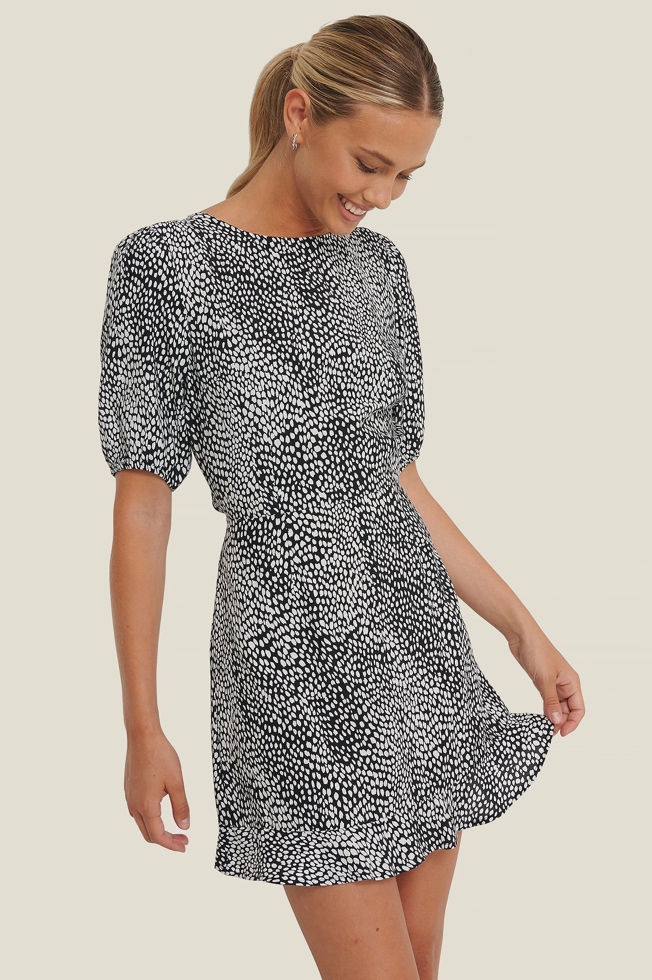 Cette robe a un col arrondi, des manches courtes avec manchettes élastiques, des boutons de fermeture derrière la nuque, un détail découpé à l’arrière avec fermeture éclair et crochet de fermeture cachée sous, des détails volantés sur l’ourlet bas et une taille courte.
