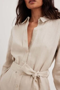 Cette robe chemise est faite en lin et a un col classique. Elle a des manches longues avec manchette simple et une taille courte. Notre robe chemise a une ceinture ajustable amovible et un bouton de fermeture.