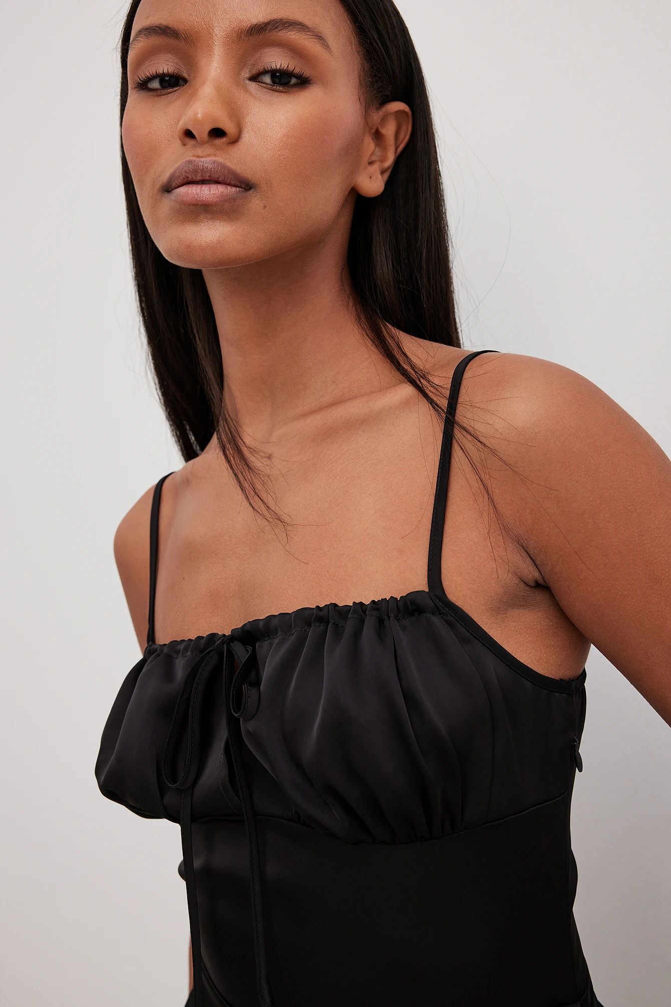 Cette robe courte est faite en satin et a des bretelles ajustables. Elle a un ajustable sur le col et un dos froncé. Cette robe courte a une fermeture éclair latérale cachée et des cordons sur les côtés.