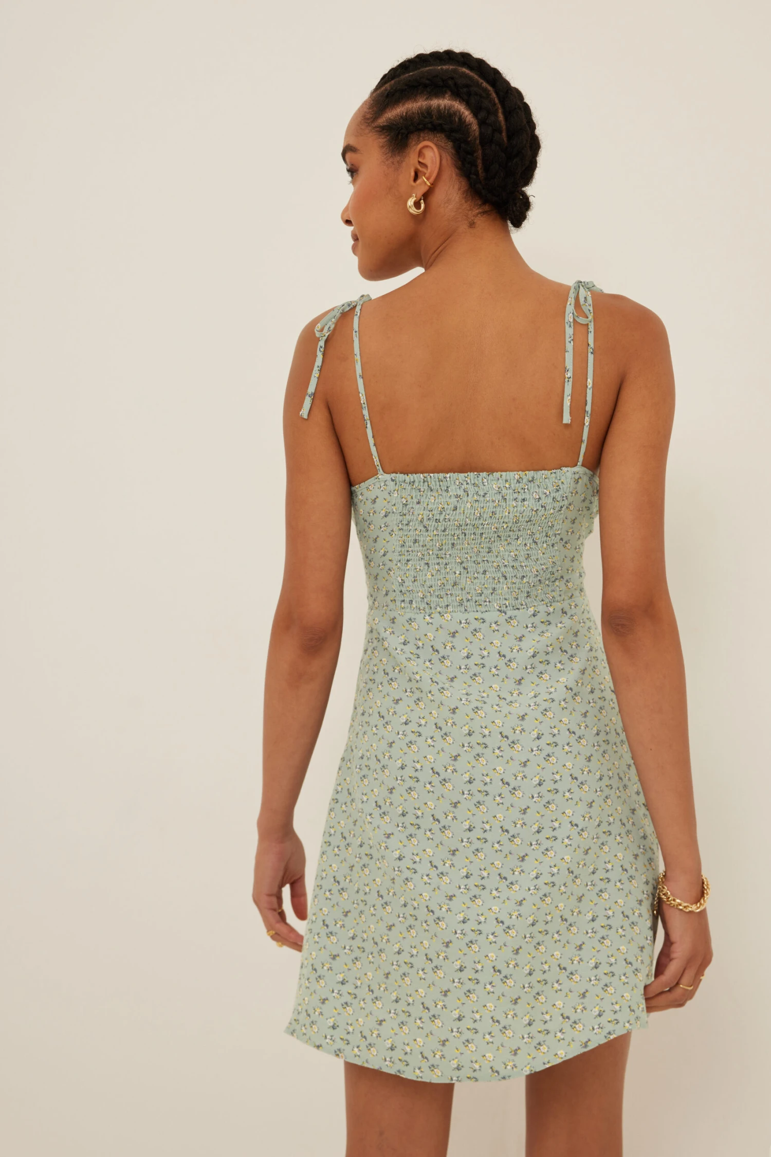 Cette robe a des bretelles réglables et fines, un col en V avec bonnets ruchés, des smocks à l’arrière, une fermeture éclair latérale, une taille courte et une coupe fluide.