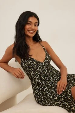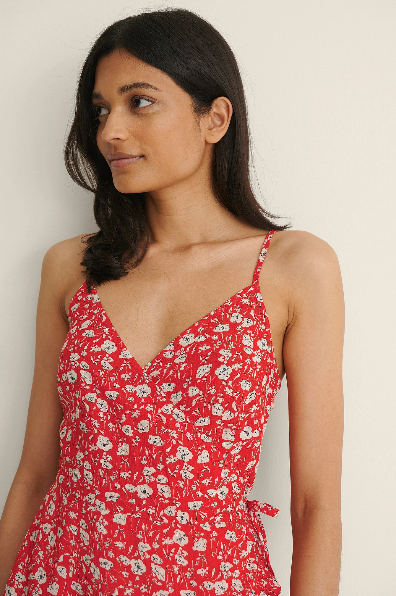 Cette robe a un col en V. Elle a des bretelles fines réglables et un design enveloppant avec cordon ajustable. Cette robe a des détails volantés, une coupe fluide et une taille courte.
