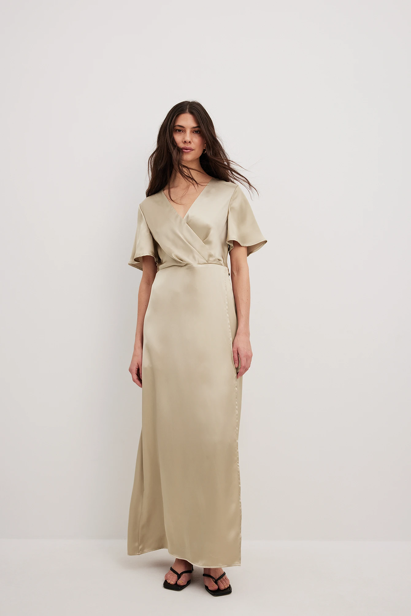 Cette robe longue a du tissu en satin. Elle a une coupe fluide et un design chevauchant avec ceinture ajustable. Cette robe longue a des manches courtes avec une coupe évasée et un col en V.
