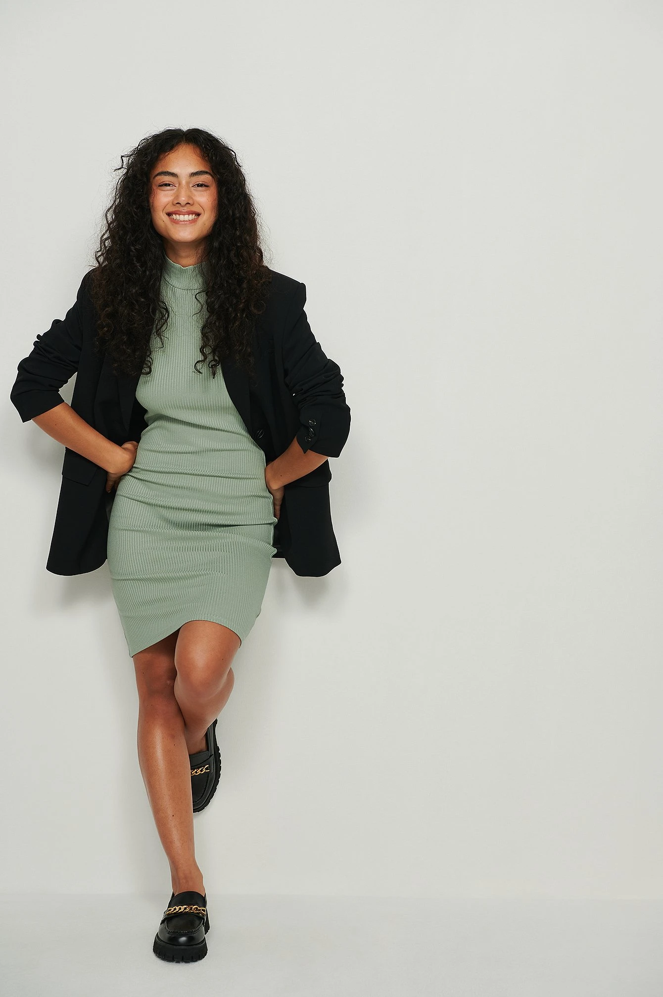 Cette robe a un col roulé, un design à côtes, de la forme serrée et une taille courte.