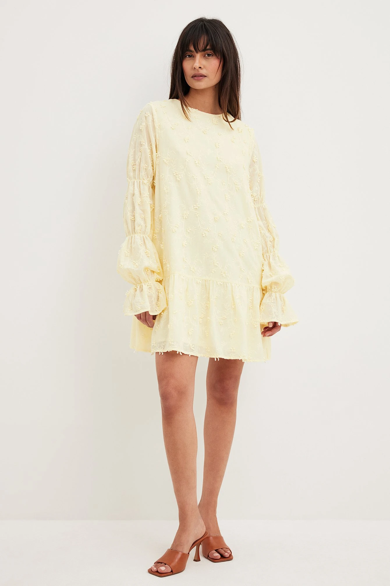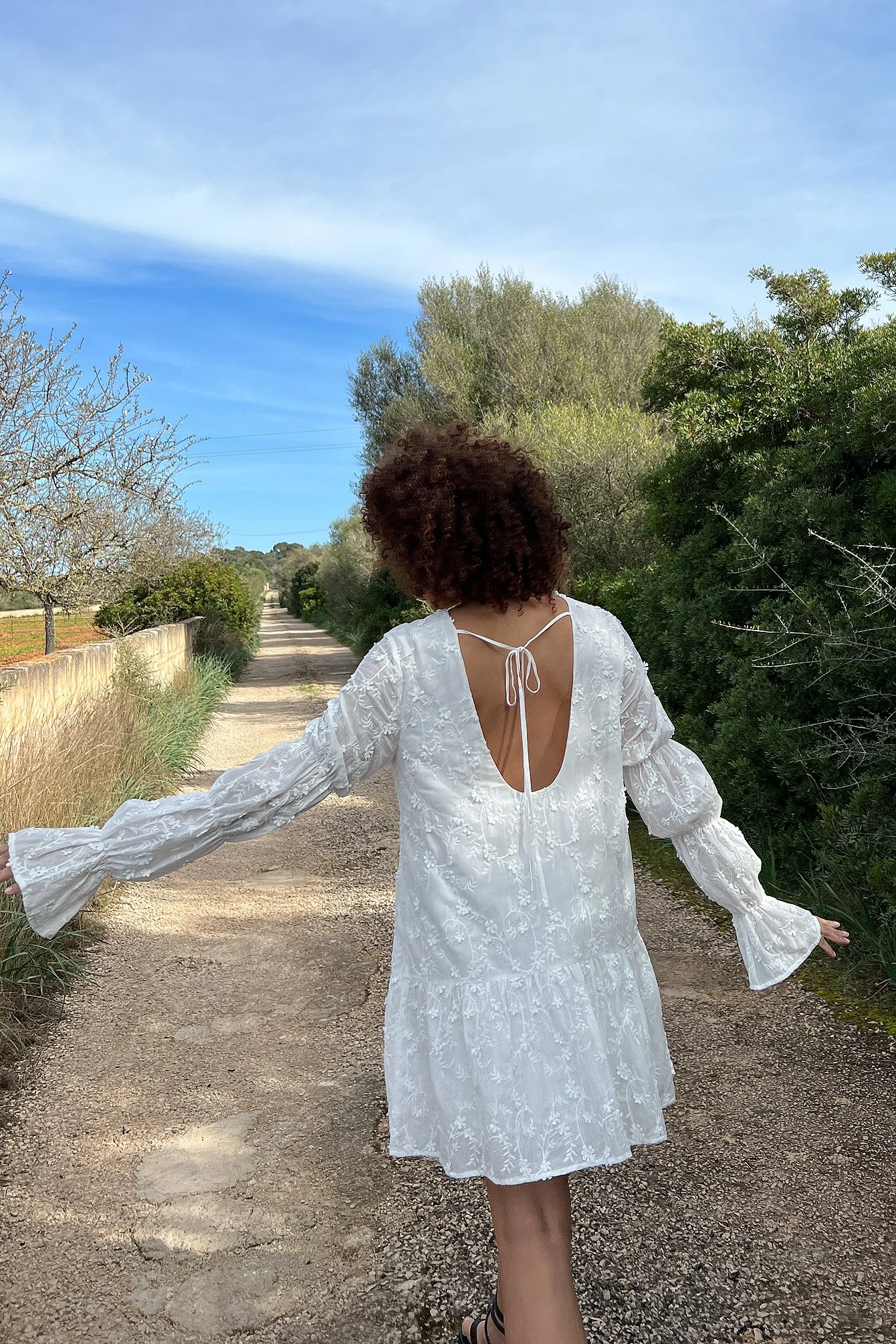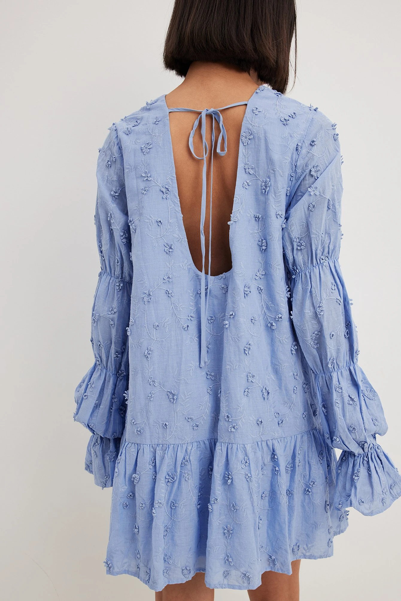 Cette robe a un col arrondi. Elle a un design à dos ouvert avec un fil fin et des manches longues avec détails élastiques. Cette robe a un design brodé et une coupe droite.