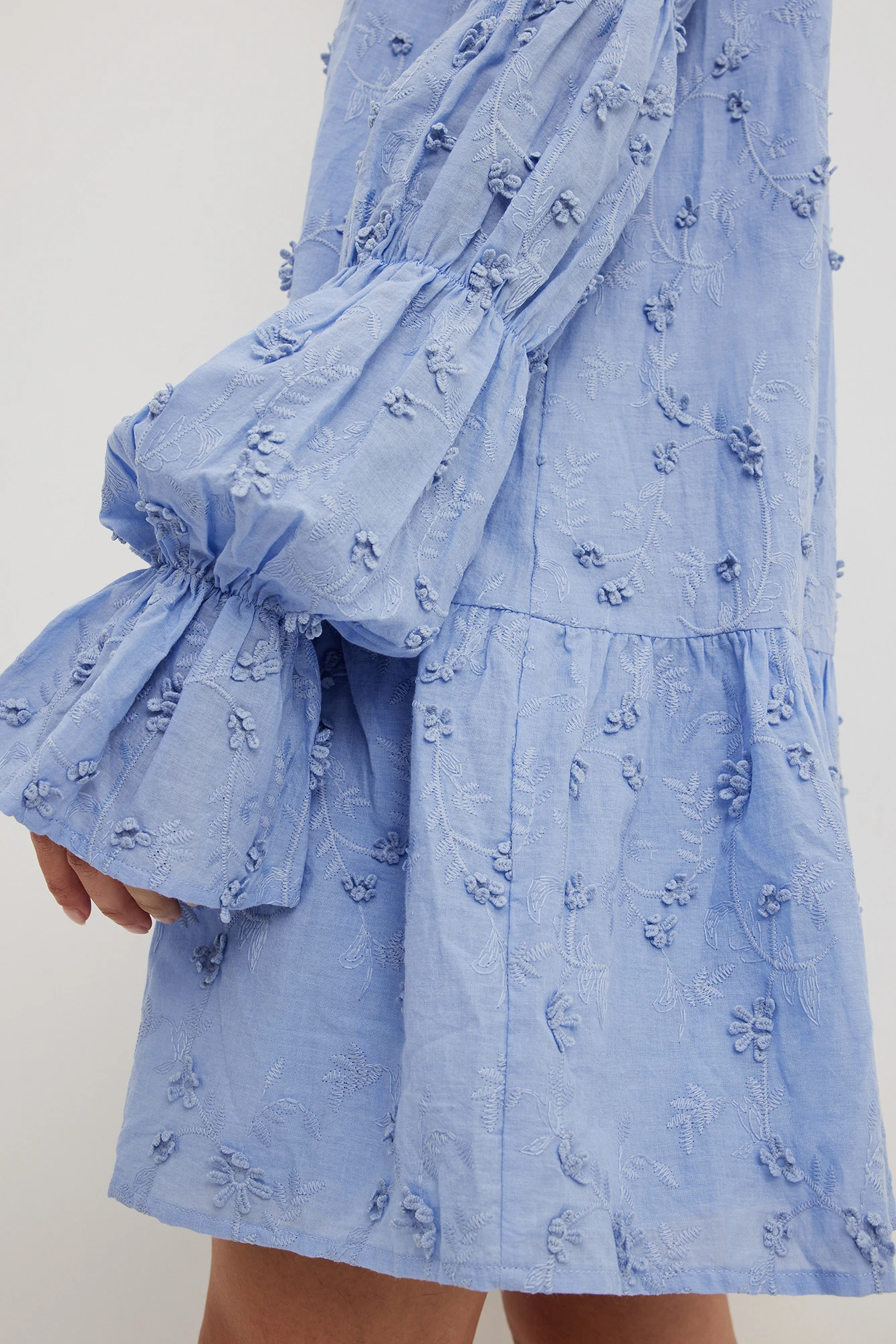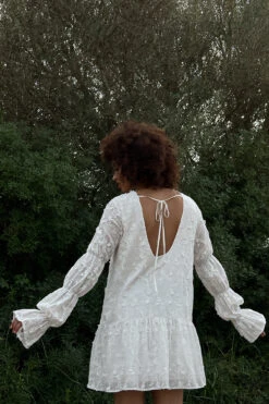 Cette robe a un col arrondi. Elle a un design à dos ouvert avec un fil fin et des manches longues avec détails élastiques. Cette robe a un design brodé et une coupe droite.