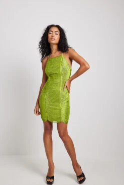 Cette robe courte a un design sans manches. Elle a des franges ruchées le long du vêtement et une bretelle ajustable avec design de croix à l’arrière. Cette robe courte a une fermeture éclair latérale.