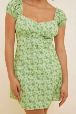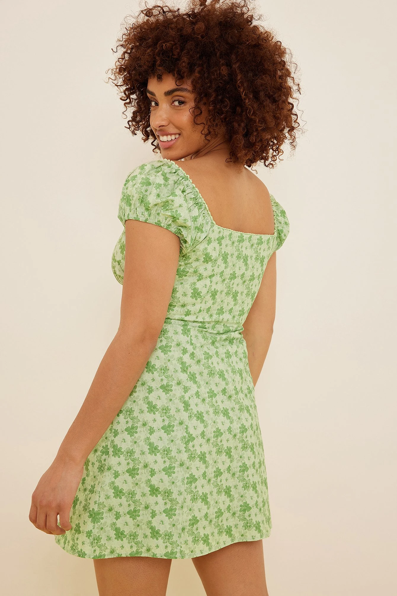 Cette robe courte a un décolleté en coeur avec petits détails en dentelle et bonnets froncés. Elle a des manches courtes bouffantes et élastiques et un laçage réglable à l’avant et à l’avant. Cette robe courte a une fermeture éclair latérale.