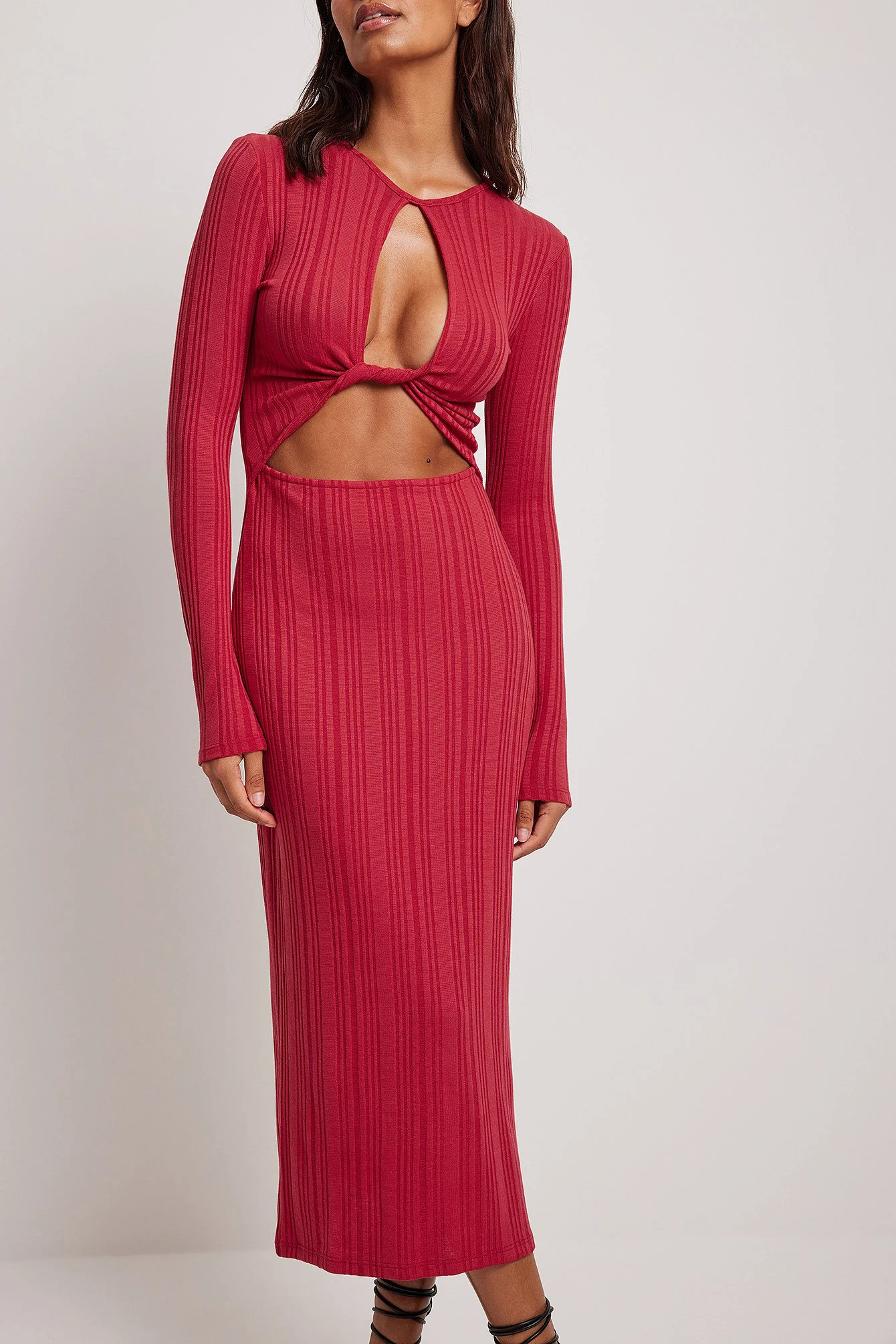 Cette robe longue est à nervures et a une encolure bateau, des manches longues, des détails découpés et un noeud à l’avant.