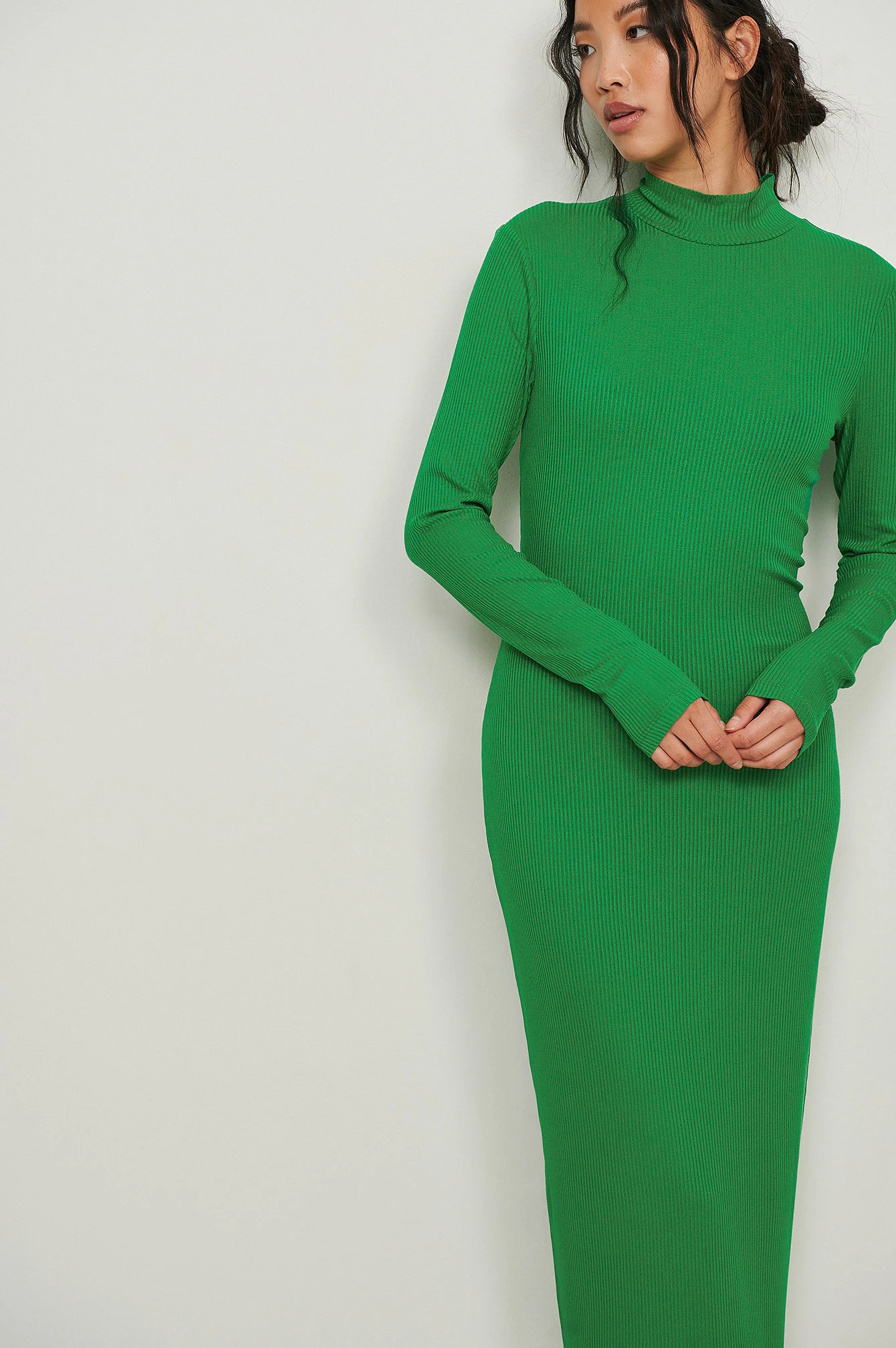 Cette robe midi est à nervures et a un col haut. Elle a des manches longues.
