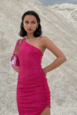 Cette robe est faite en sequin et a un style à une épaule, un design asymétrique et une doublure intérieure.