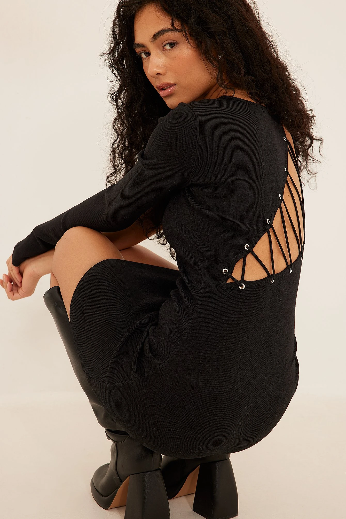 Cette robe courte a un col arrondi, un design à une manche, un découpage avec détail de lacet à l’arrière et une matière en tricot à nervures.