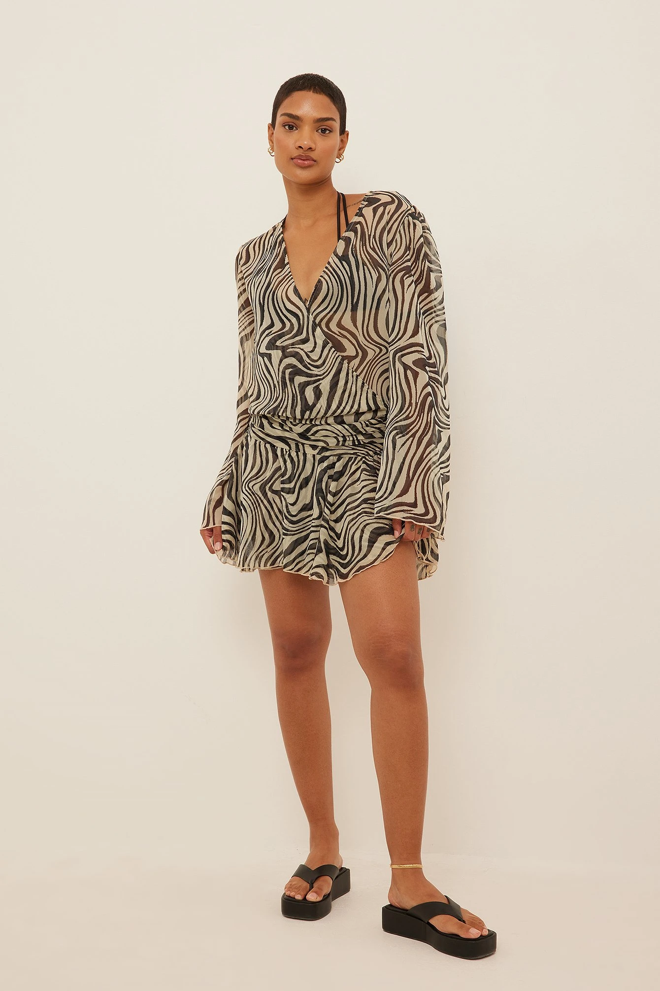Cette robe courte a des manches longues, des froissements avec fronce et une matière transparente.