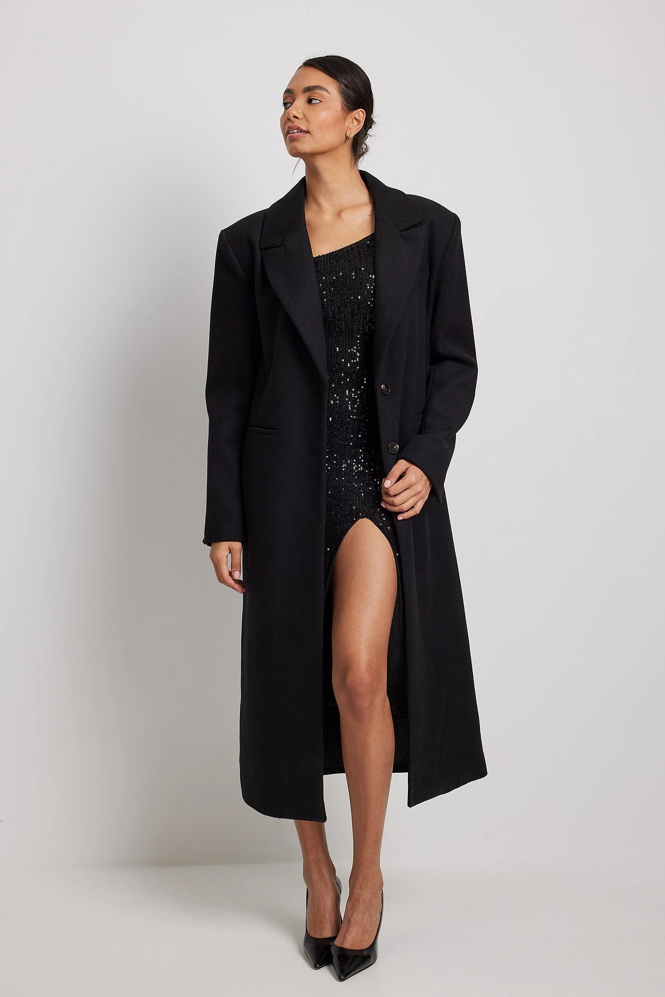 Cette robe midi est faite en sequin et a une bretelle fine et élastique, un design asymétrique au cou et un détail fendu.