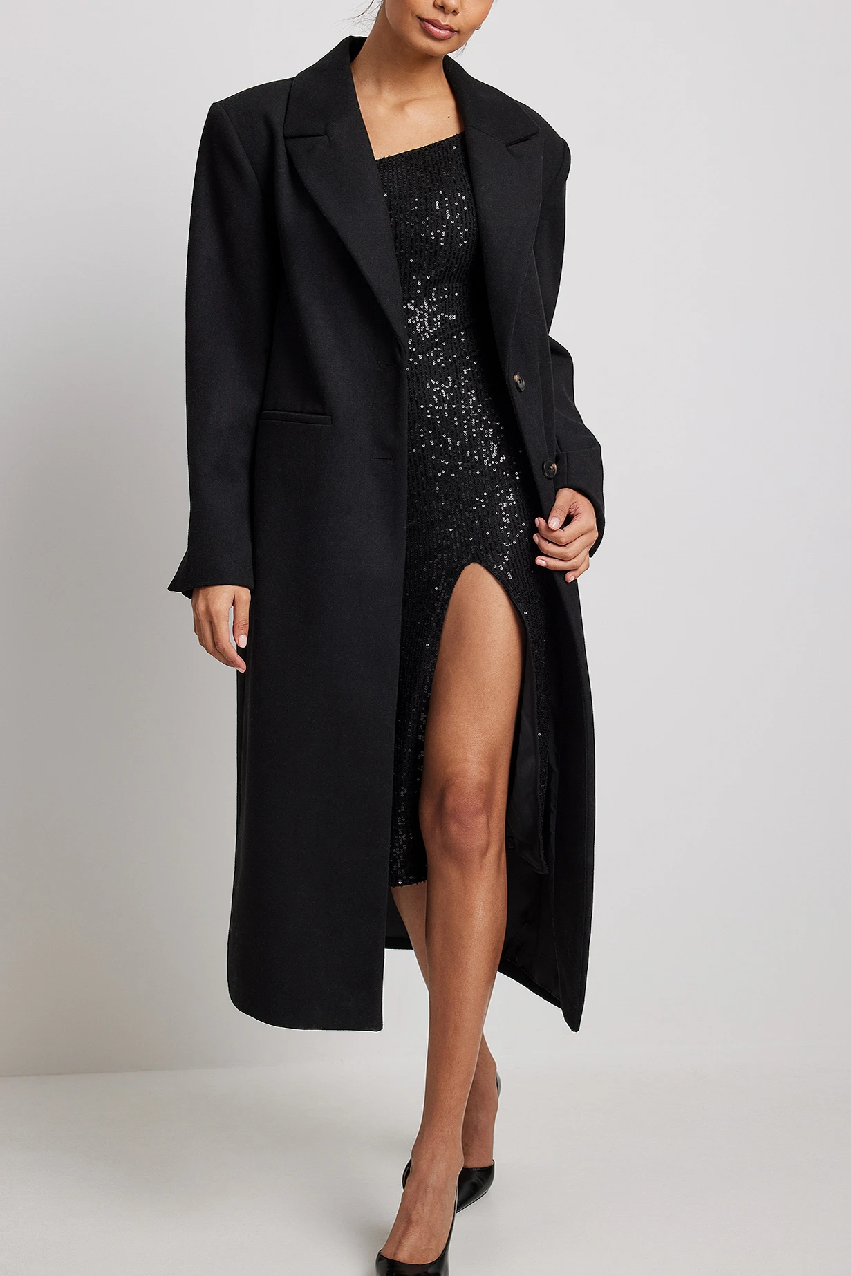 Cette robe midi est faite en sequin et a une bretelle fine et élastique, un design asymétrique au cou et un détail fendu.