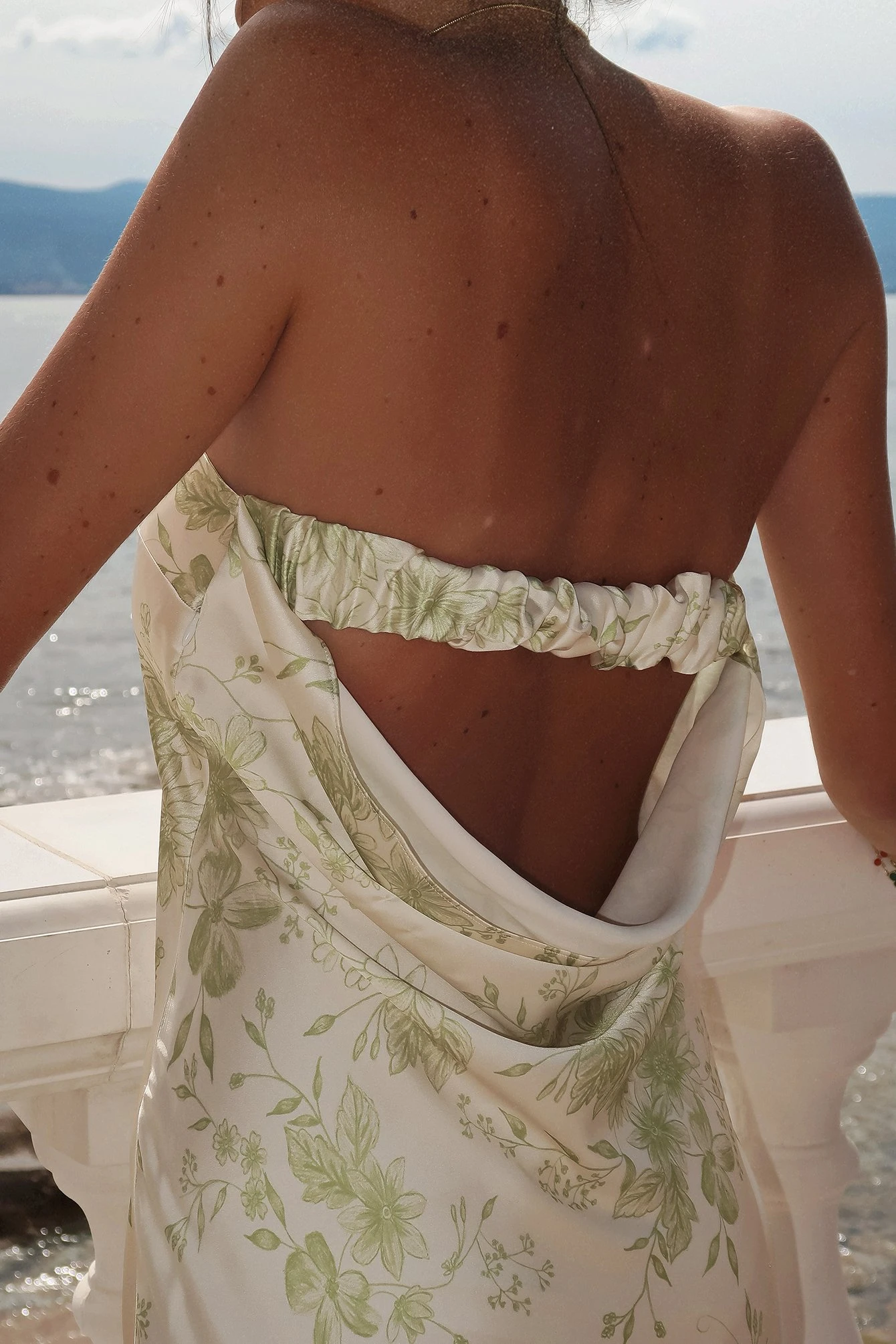 Cette robe midi est en satin et a un design à bandeau. Elle a une garniture intérieure en silicone et une fermeture éclair latérale cachée sur le côté. Cette robe midi a un élastique à l’arrière, un détail découpé et un ourlet cascade à l’arrière.