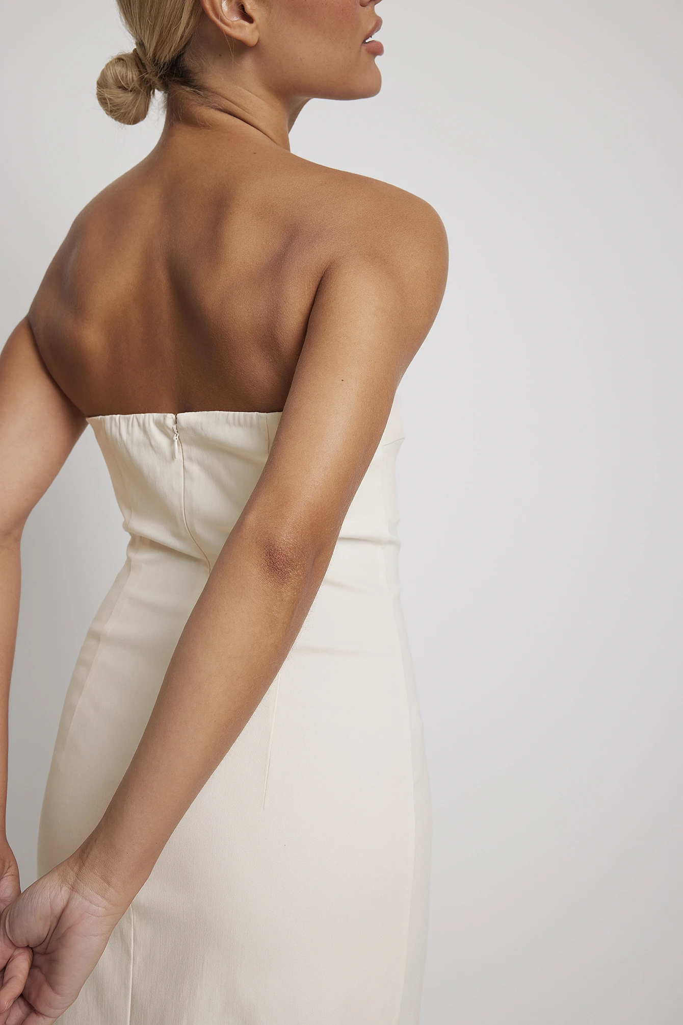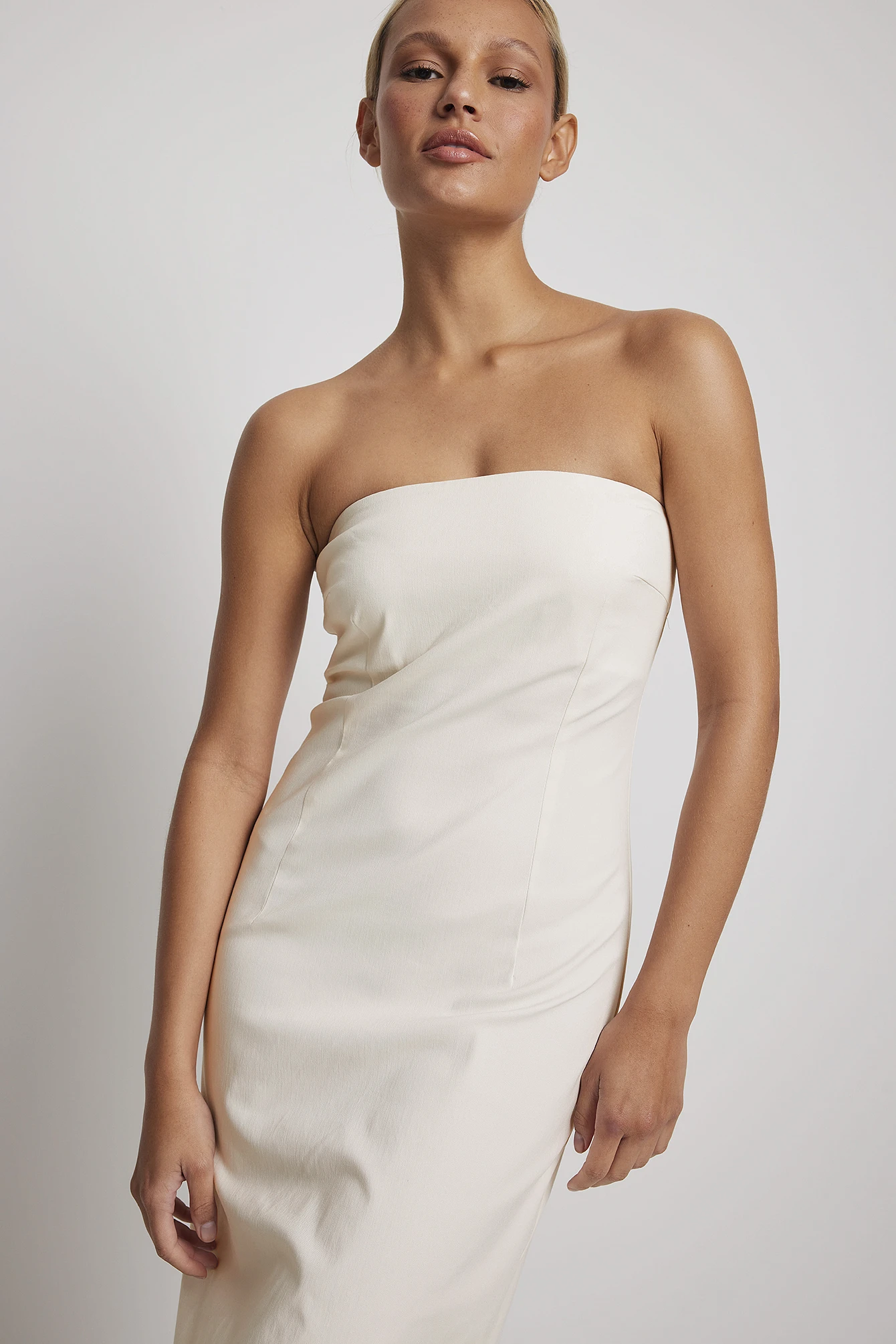 Cette robe midi a un design à bandeau, une coupe moulante, un tissu élastique et une fermeture éclair à l’arrière cachée.