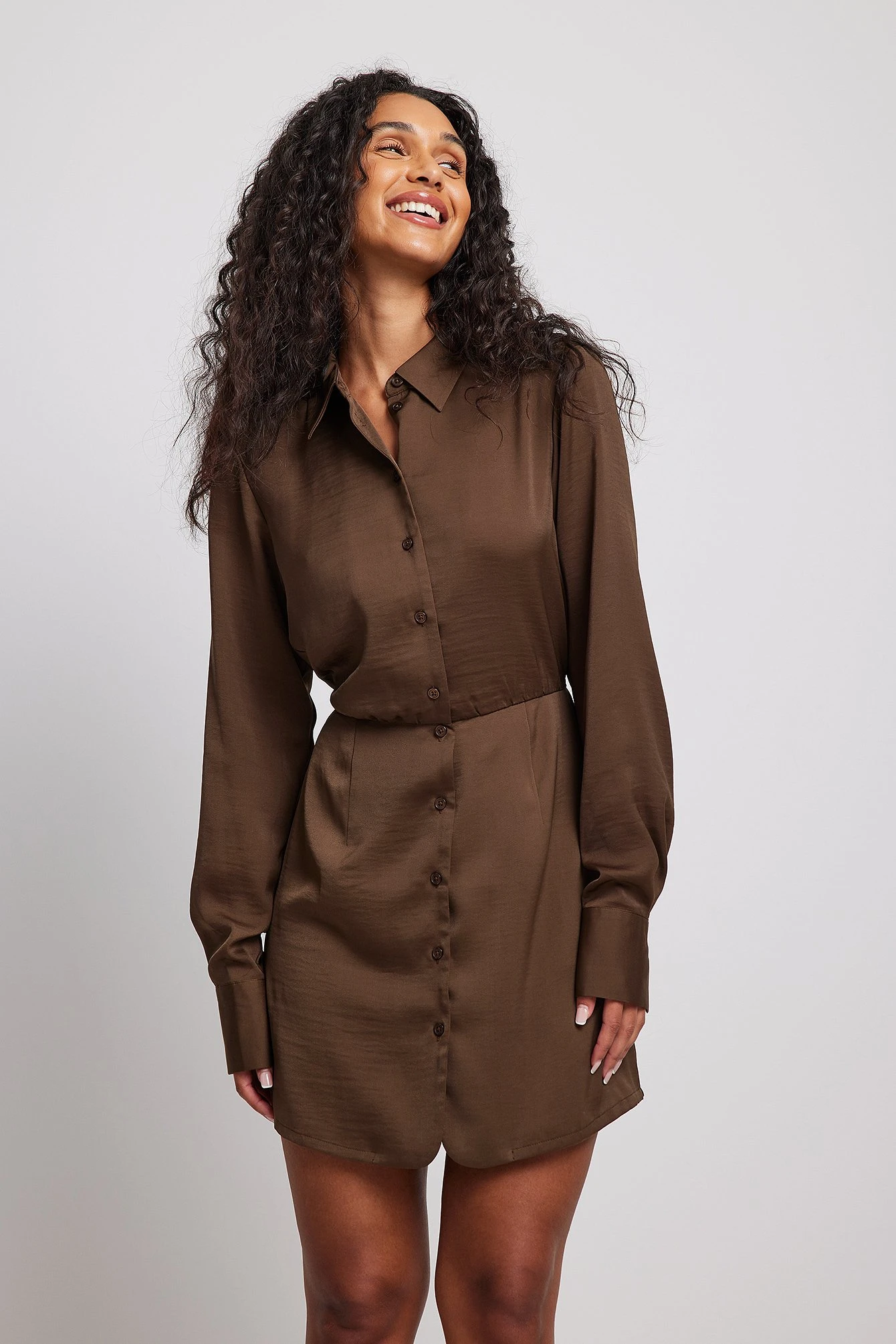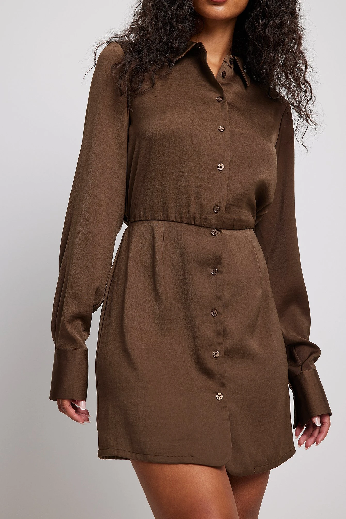 Ce design de robe t-shirt a un col classique, des longues manches avec manchettes boutonnées, un bouton de fermeture à l’avant, une ceinture élastique à l’arrière et une jupe ajustée.
