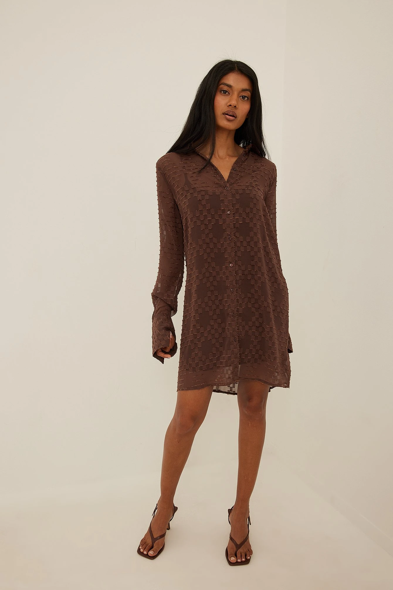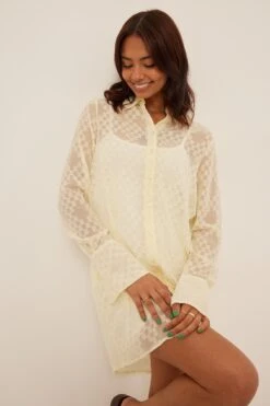 Cette robe chemise est transparente et a un col classique, un bouton de fermeture et des manches longues avec boutons de manchette.