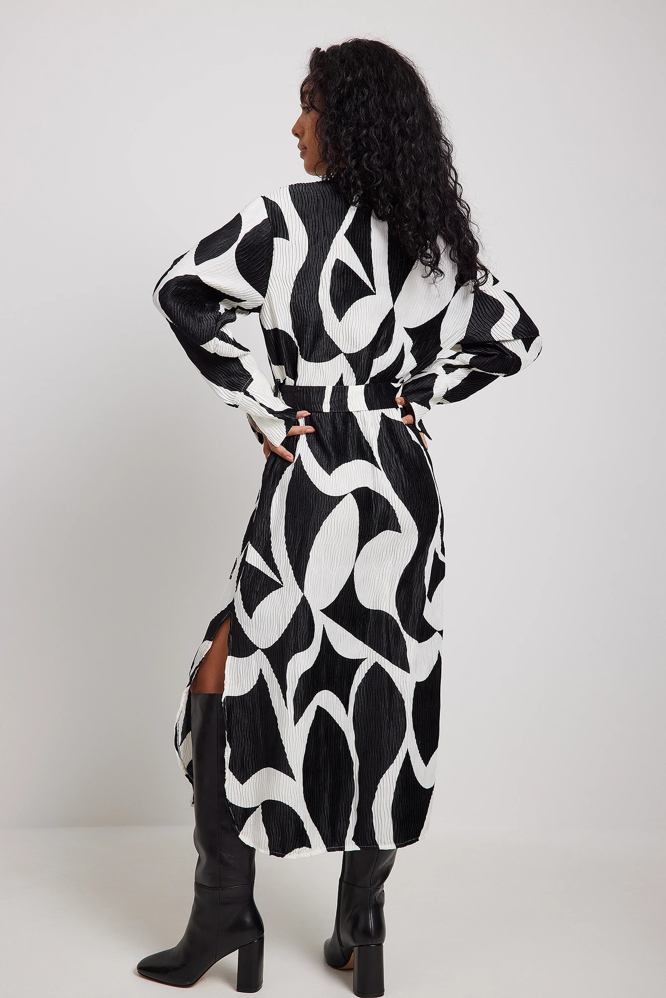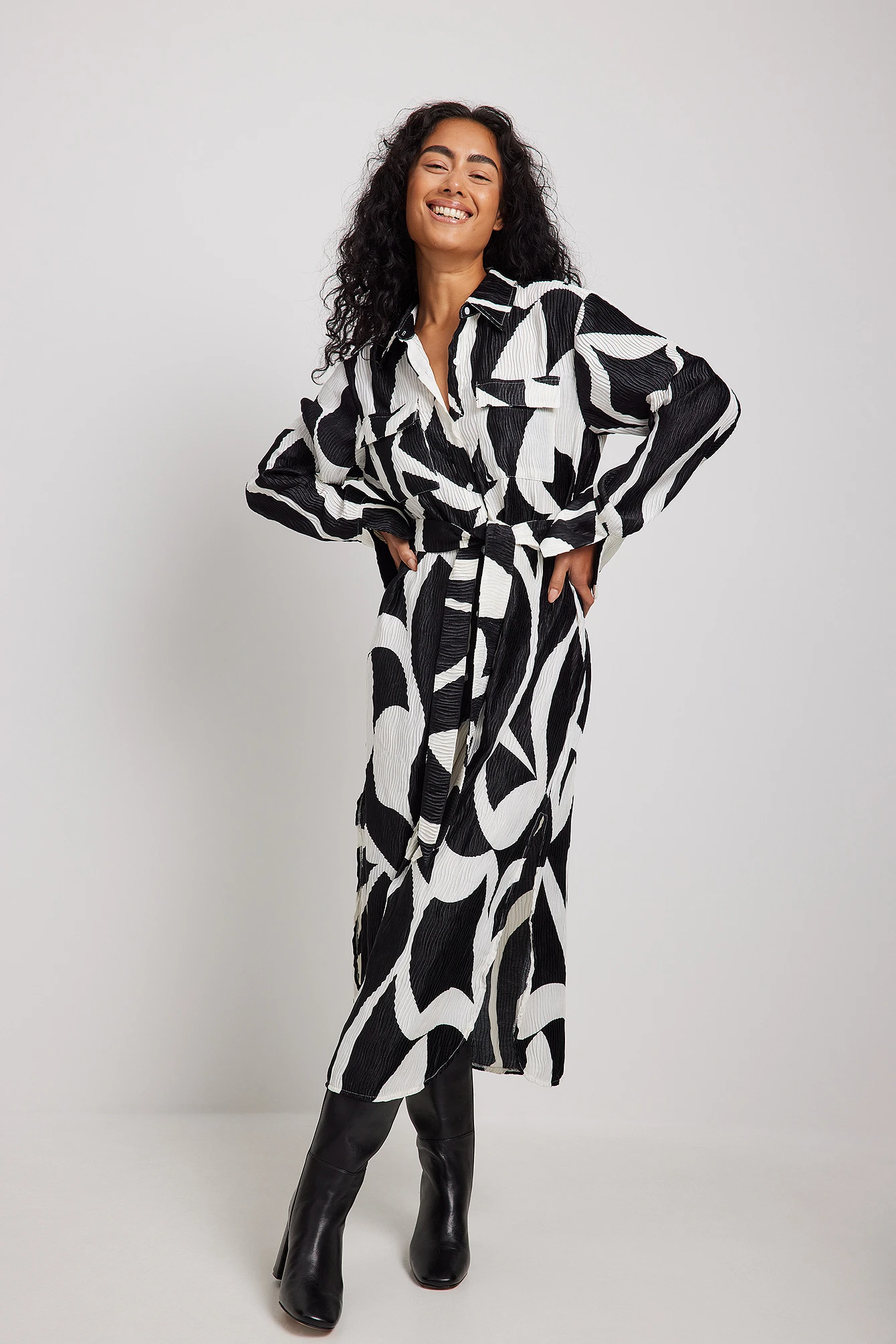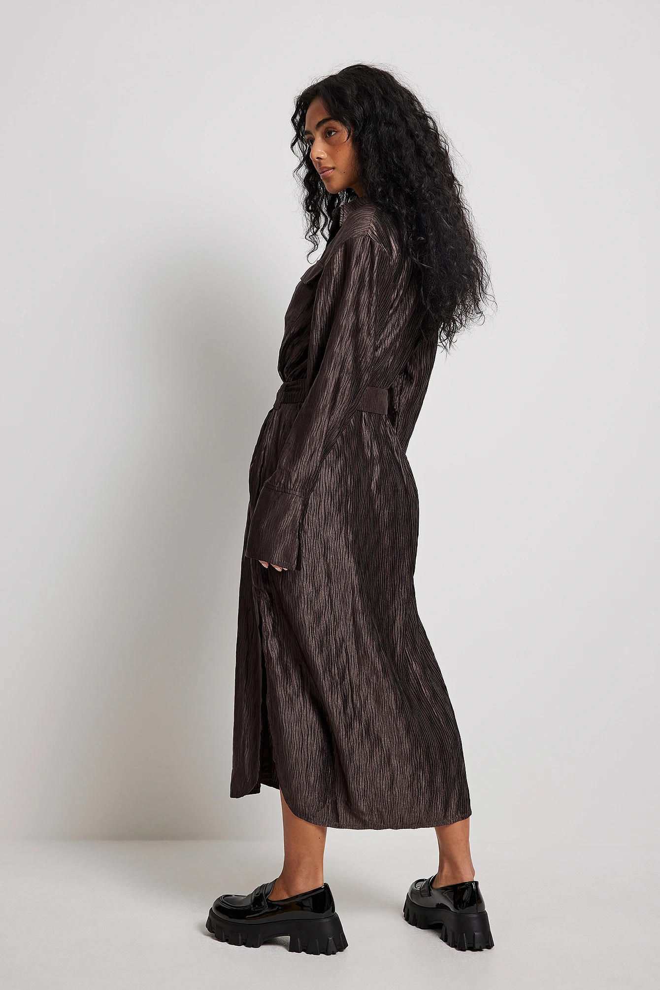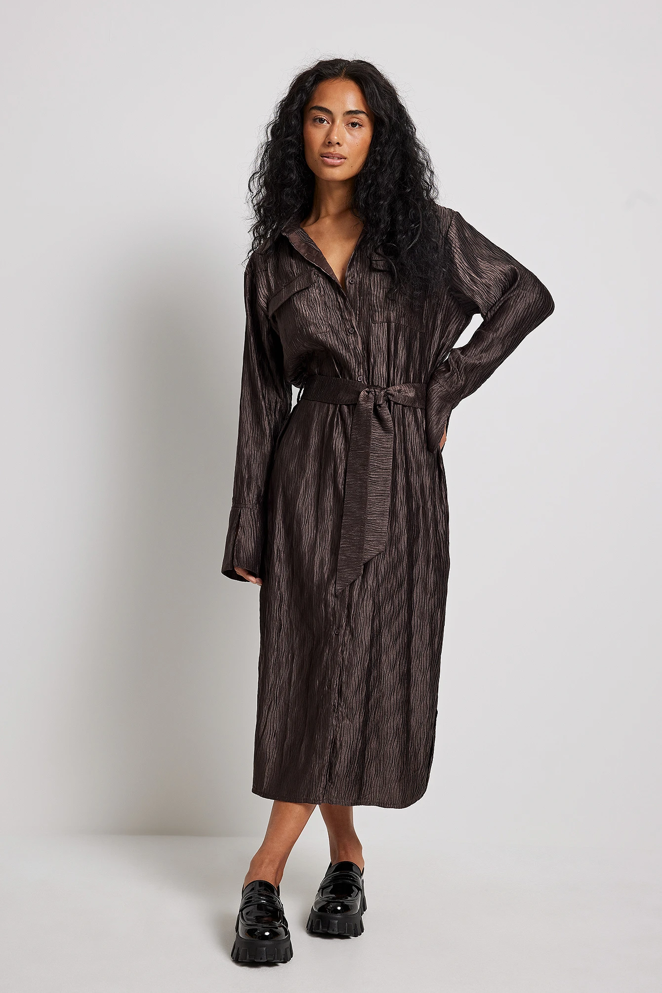 Cette robe midi a un col classique, des manches longues avec manchettes larges avec détails fendus, deux poches poitrine, un bouton de fermeture à l’avant, une ceinture ajustable amovible et une matière structurée.