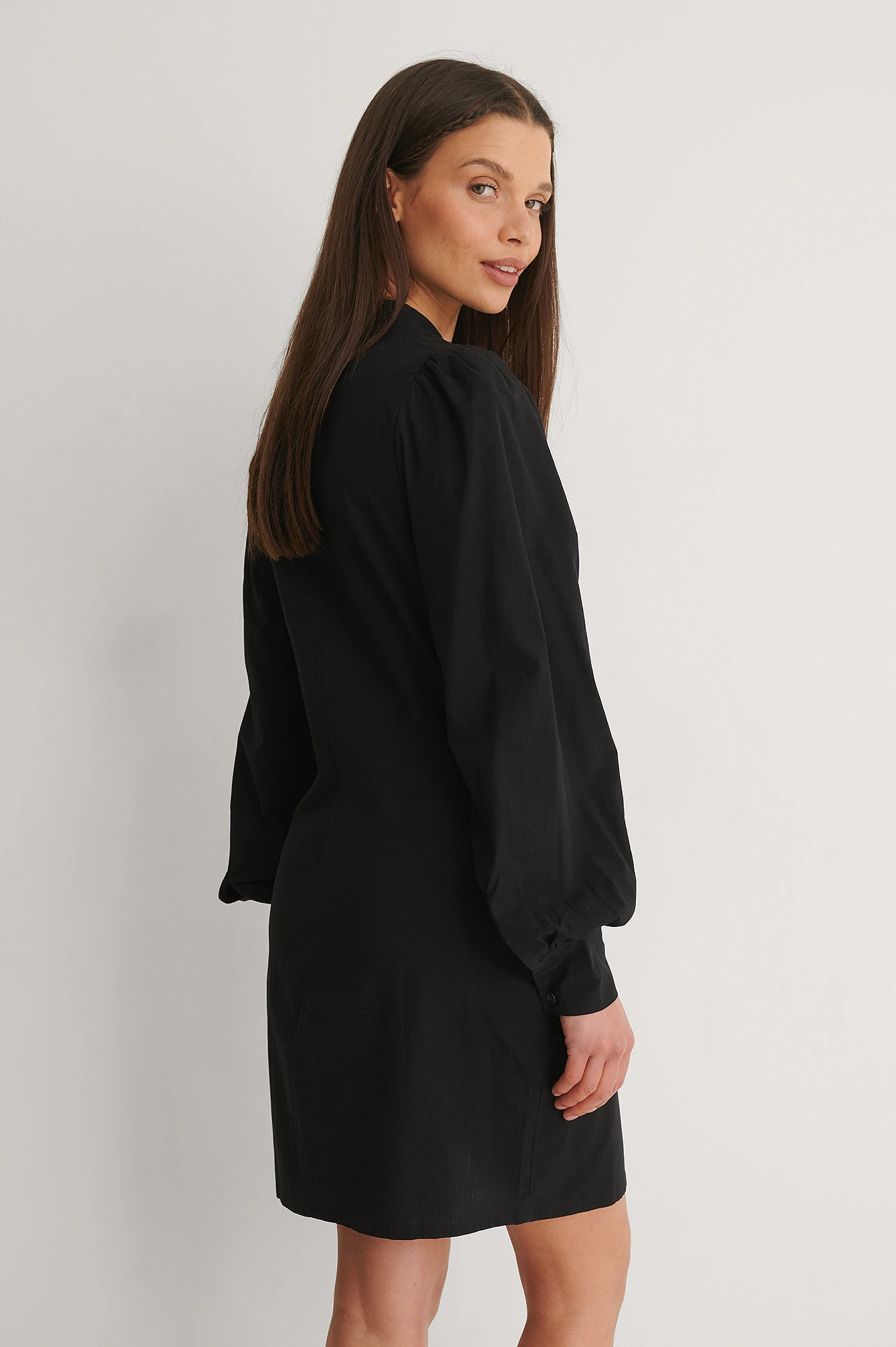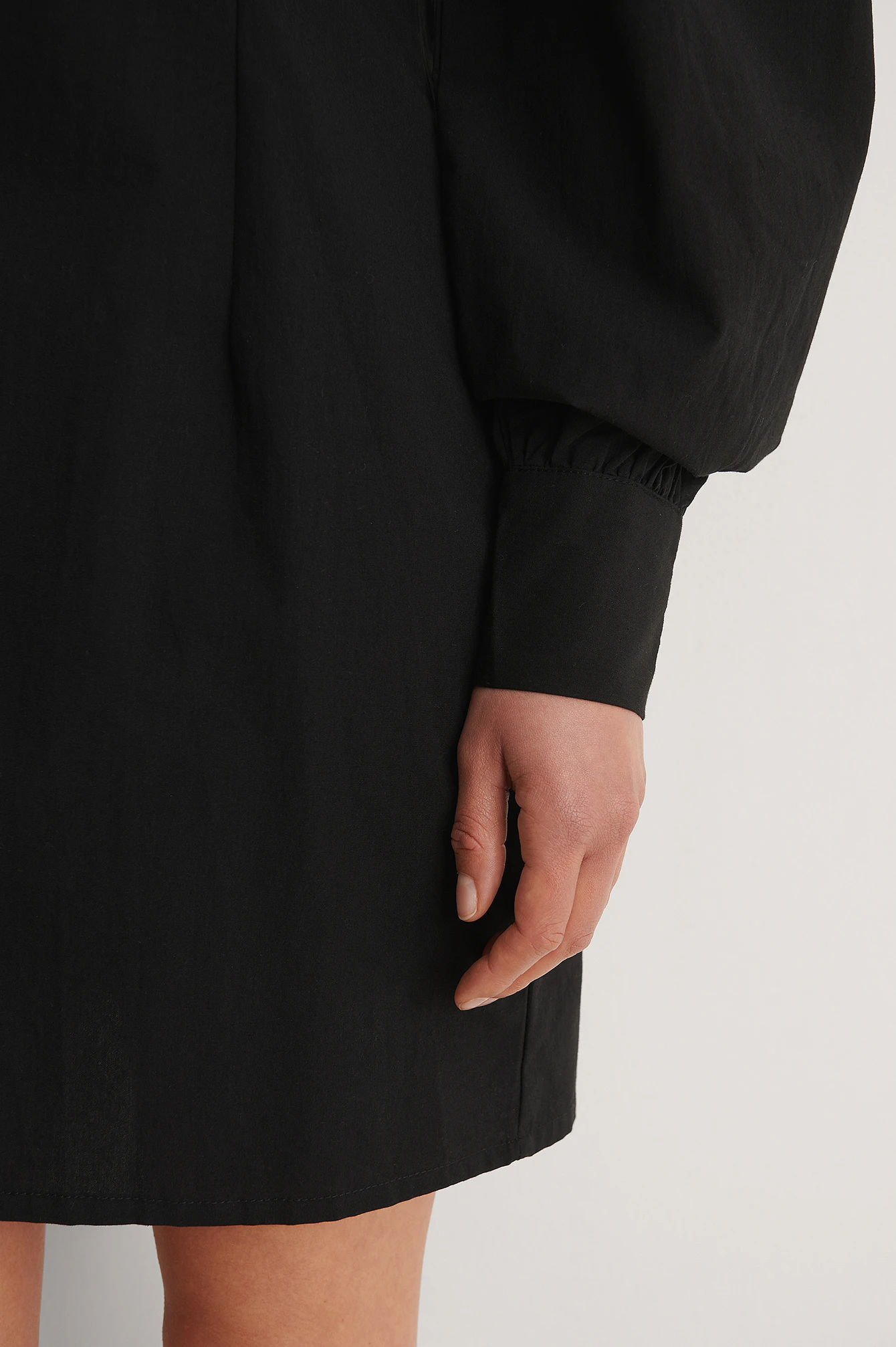 Cette robe a un col haut, des manches longues, une taille midi et une fermeture éclair arrière dissimulée.