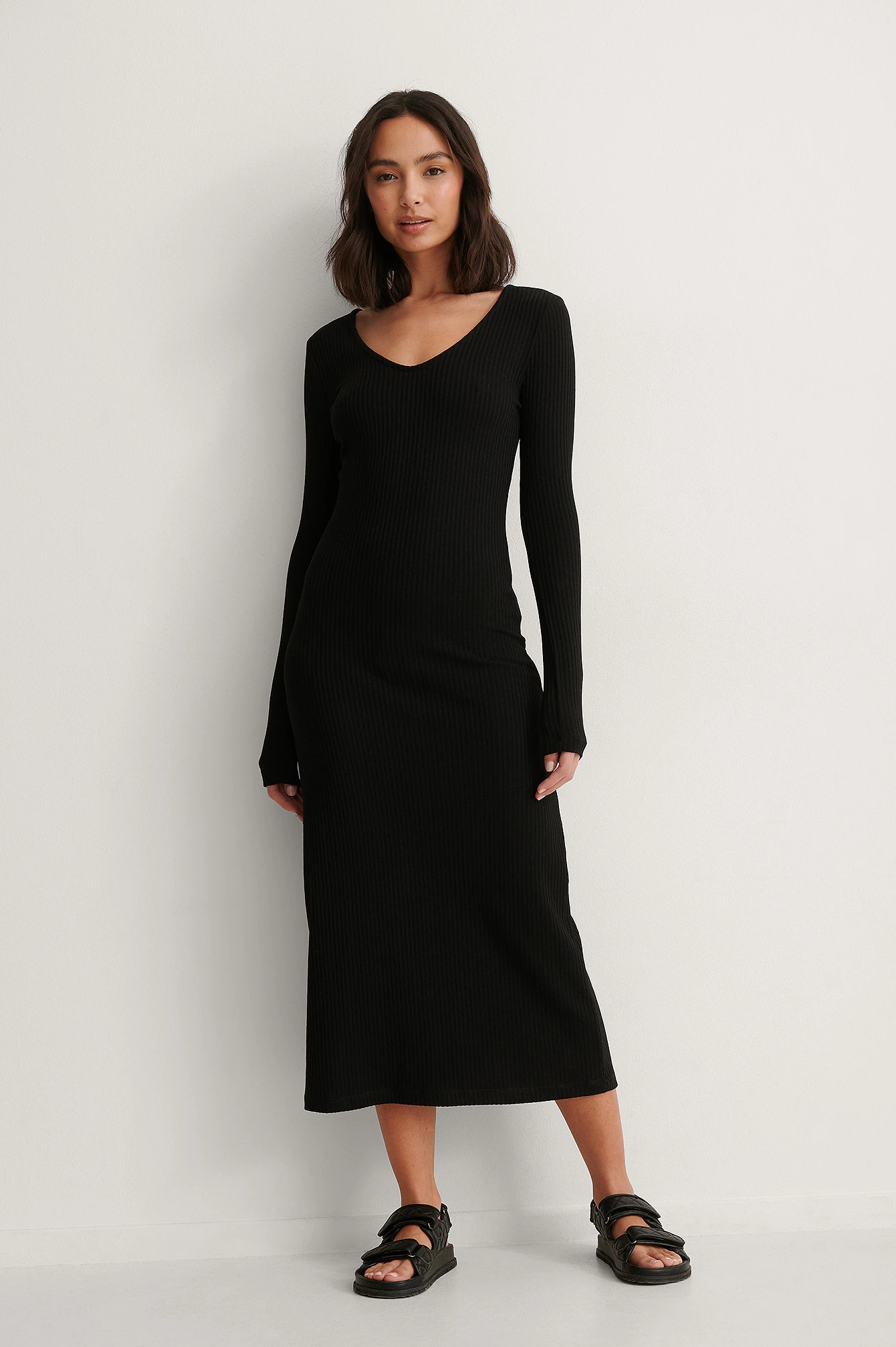 Cette robe a un design à côtes avec col en V, des manches longues et une taille midi.