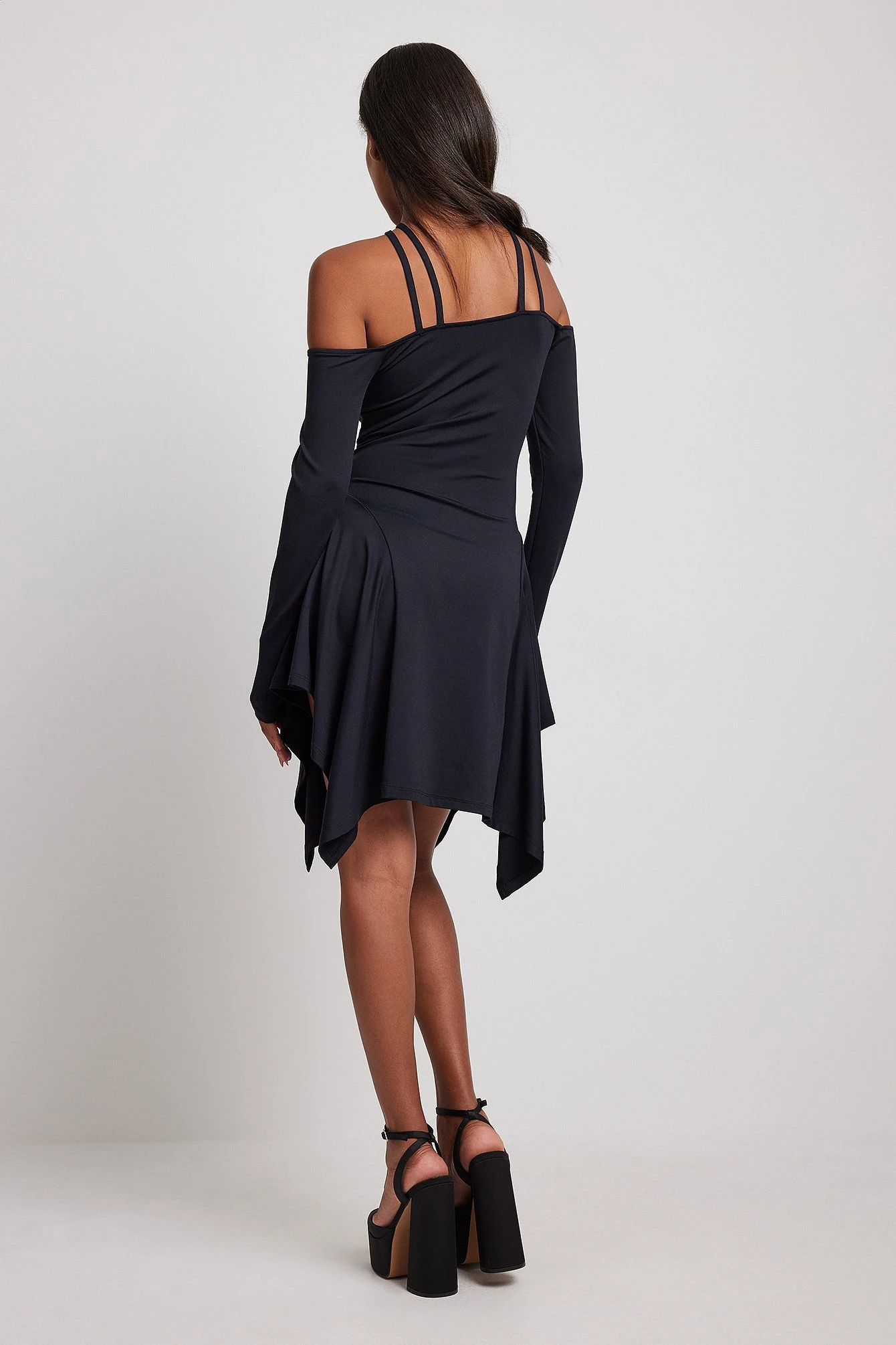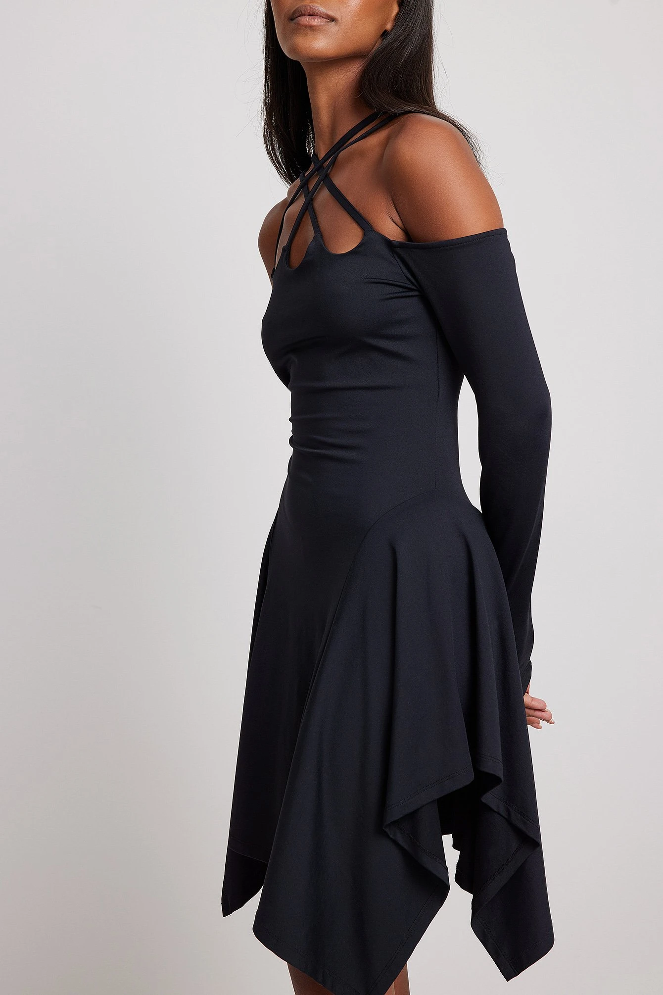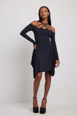 Cette robe courte a un style à épaules dénudées, des bretelles sur le col avec modèle de bretelle à nouer dans le cou et une jupe à volants.